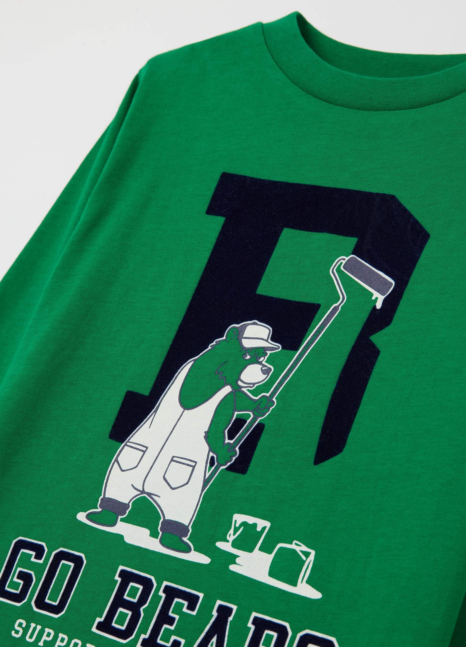 100% cotton T-shirt with long sleeves. Round neck. Bear with paintbrush print and flocked ''B” lettering on the front. Flocked ''Go Bears - Support your team” lettering print on the front.