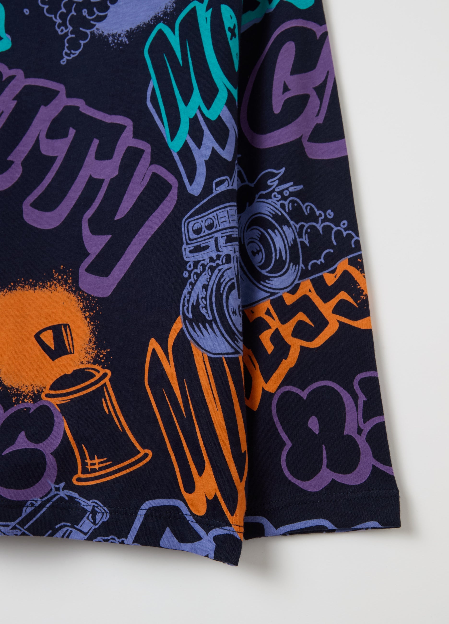 100% cotton T-shirt with long sleeves. Round neck. Graffiti-style off-road and lettering print.