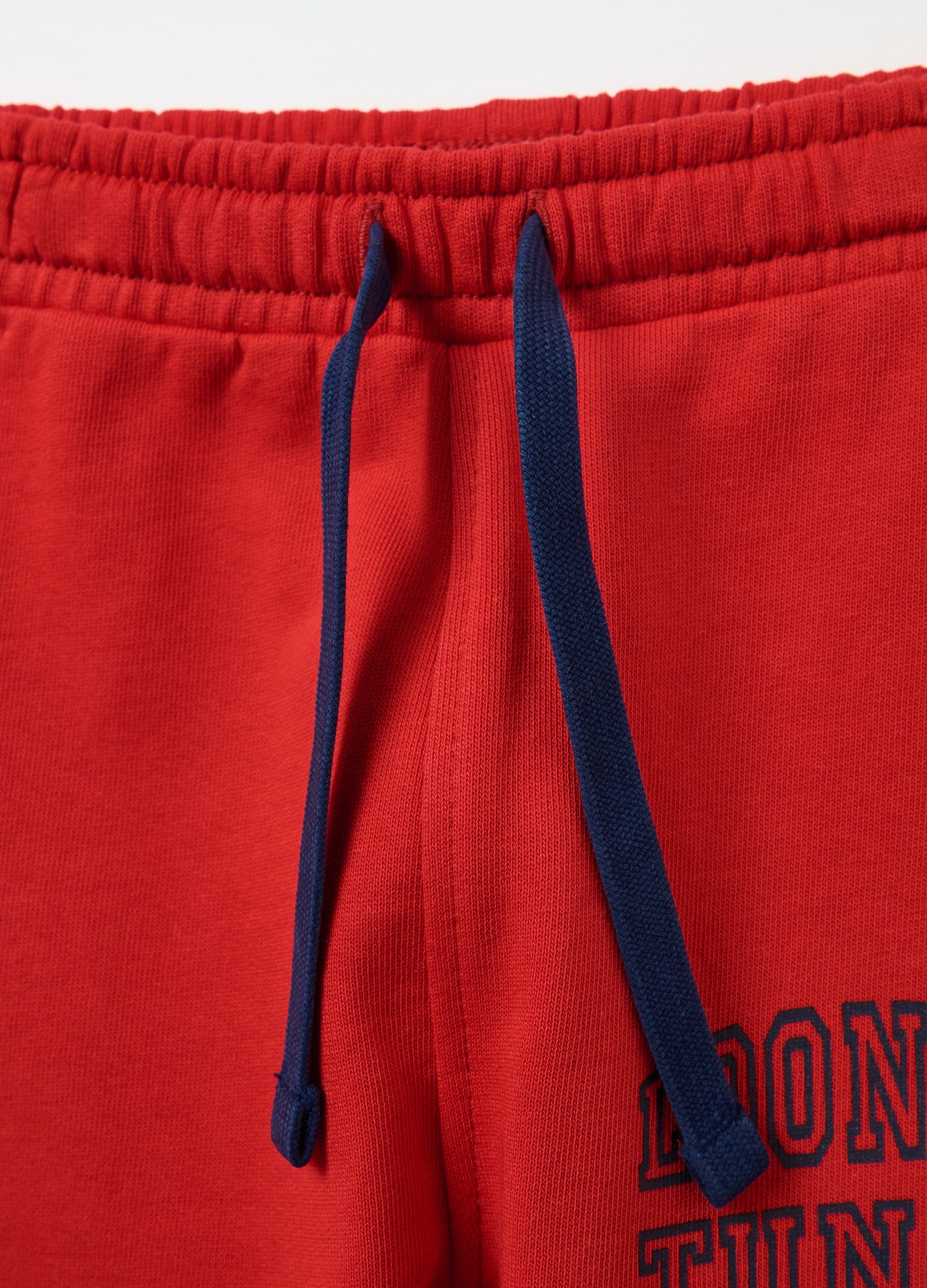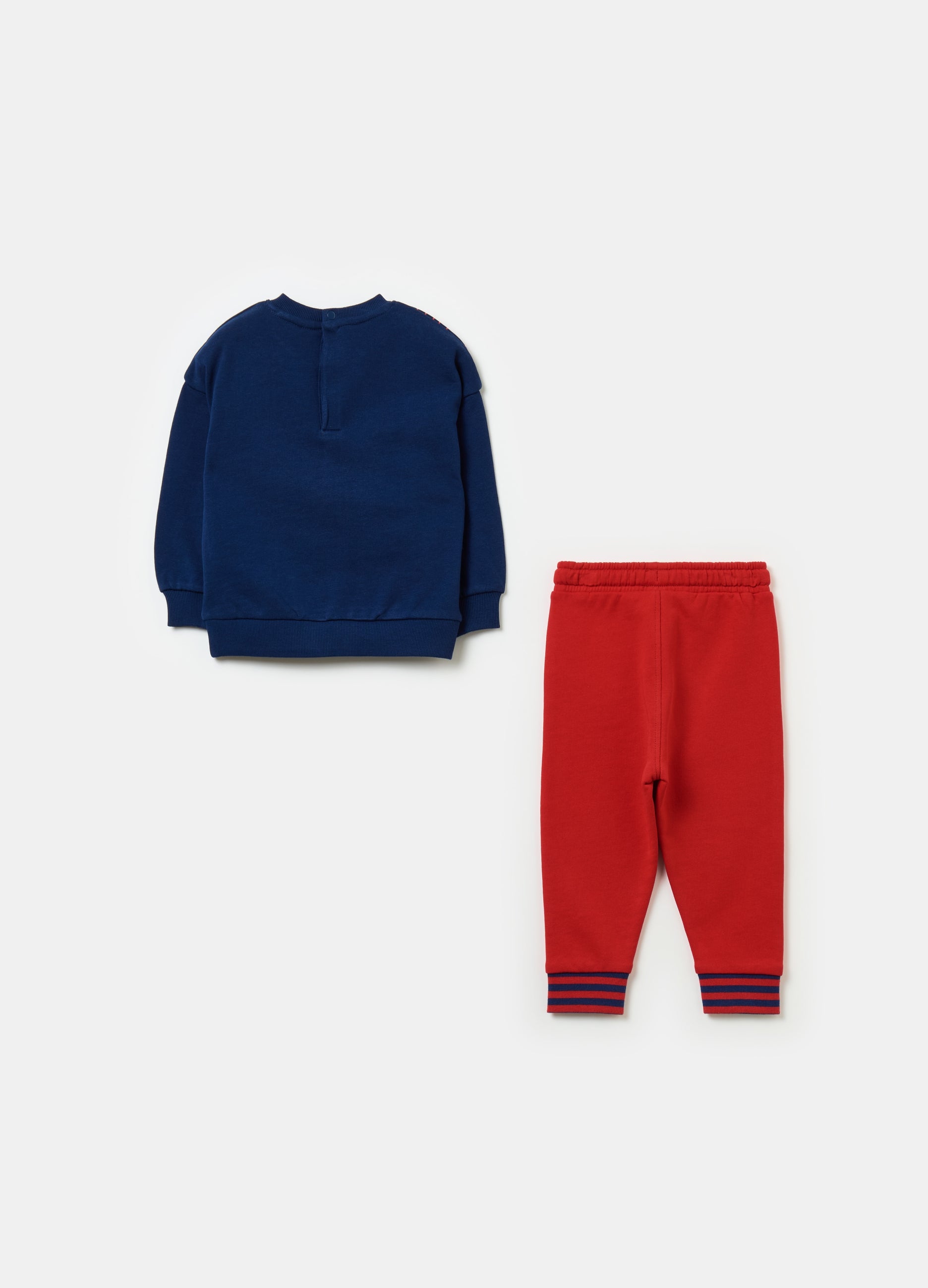 100% cotton French terry jogging set (non-brushed fleece lining). Top with round neck and snap buttons on the back. Drop shoulders. Looney Tunes Daffy Duck and Sylvester the Cat basketball players and lettering print on the front. Joggers with tape drawstring. Printed lettering on the side. Ribbed ankles with striped pattern.