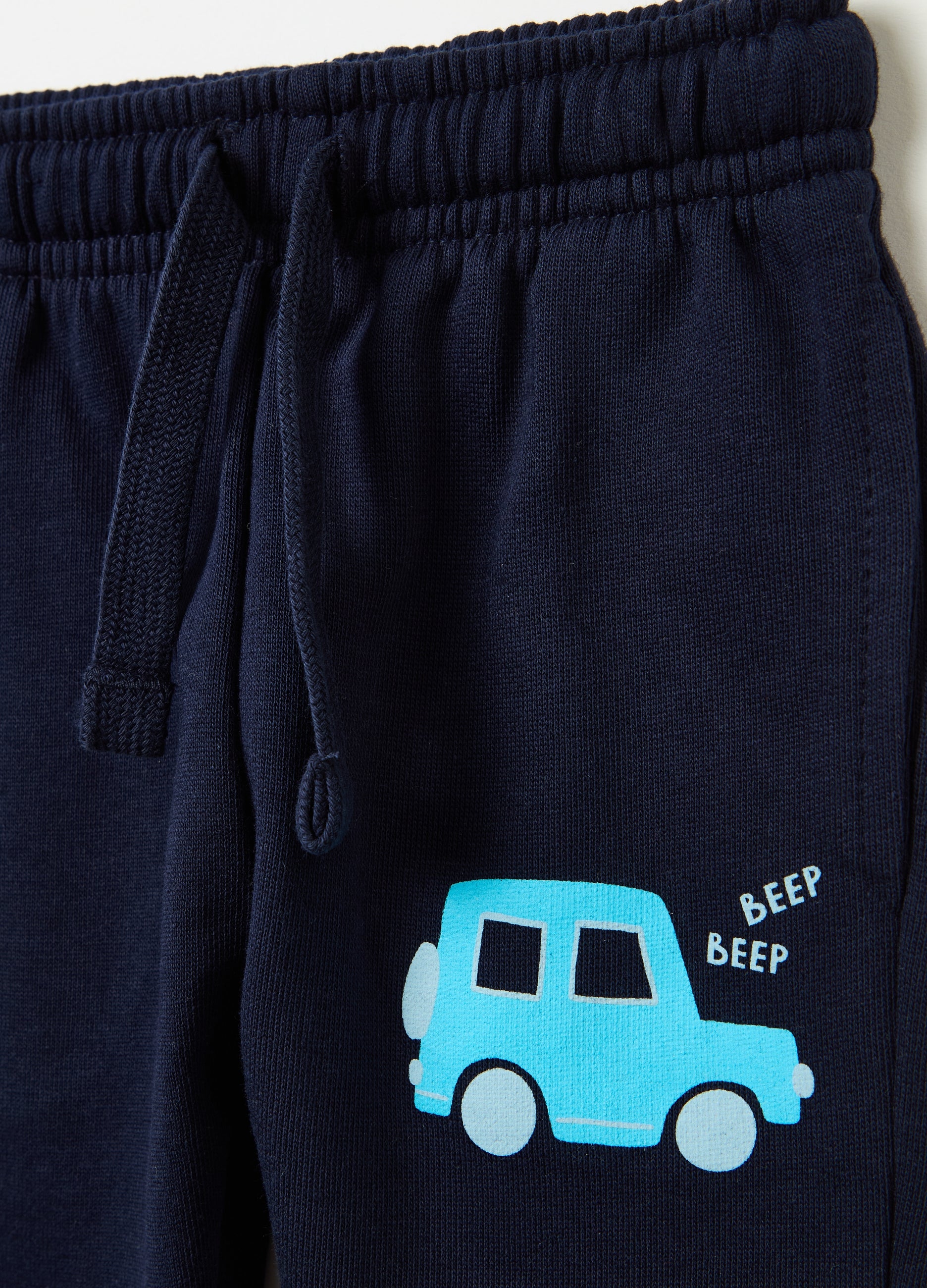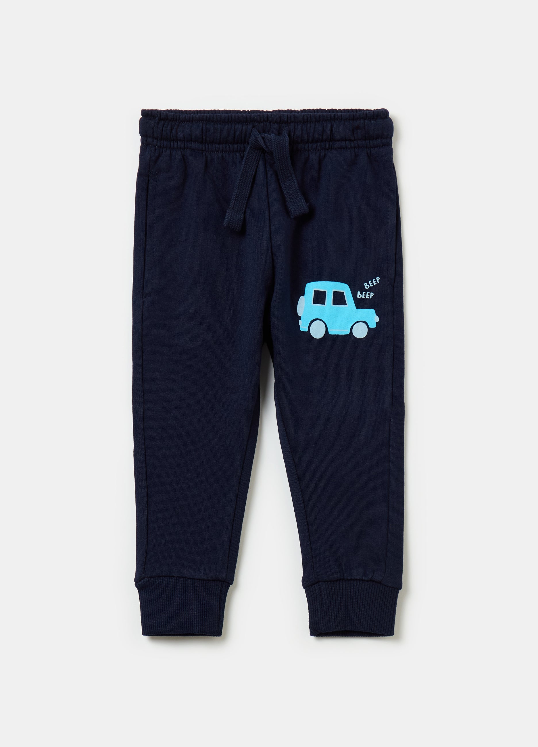 Joggers in 100% cotton plush with tape drawstring. Cars and lettering print on the side. Two vertical pockets. Ribbed ankle cuffs.