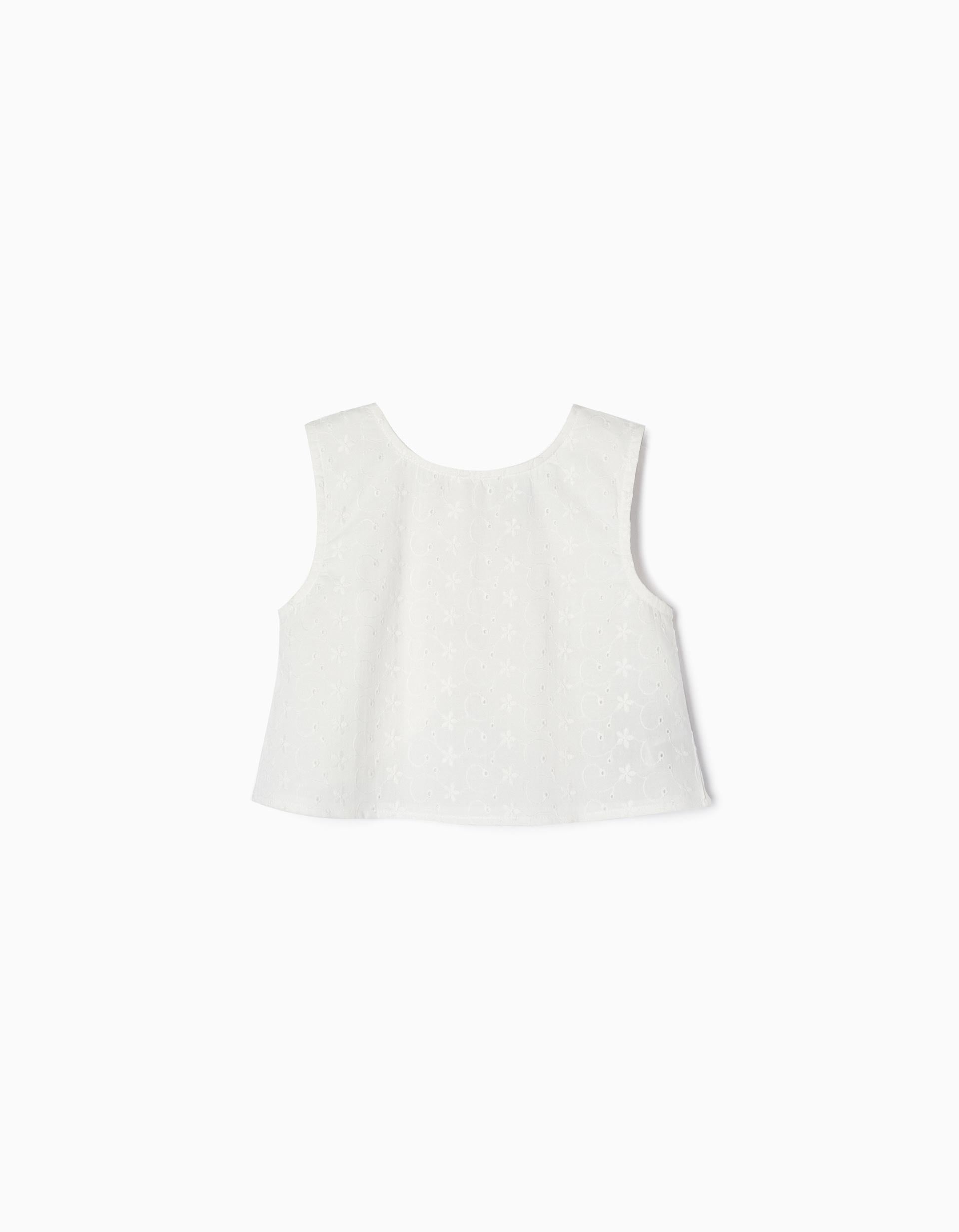 White sleeveless top for girls, 100% cotton. With lining for greater comfort. Decorated with english embroidery. Fastens at the back with concealed buttons and three decorative bows. Na original and lovely top for spring-summer, perfect to wear with skirts and shorts.