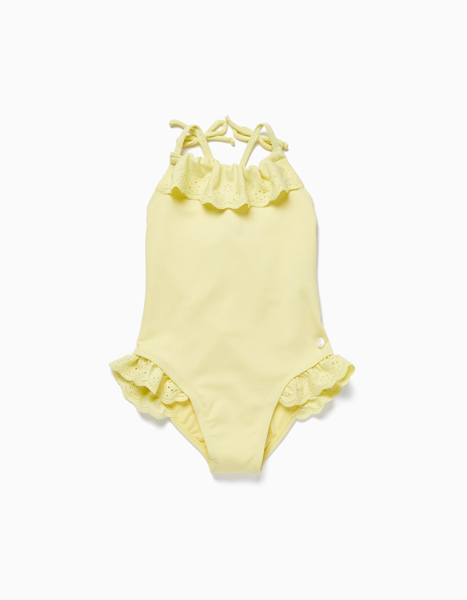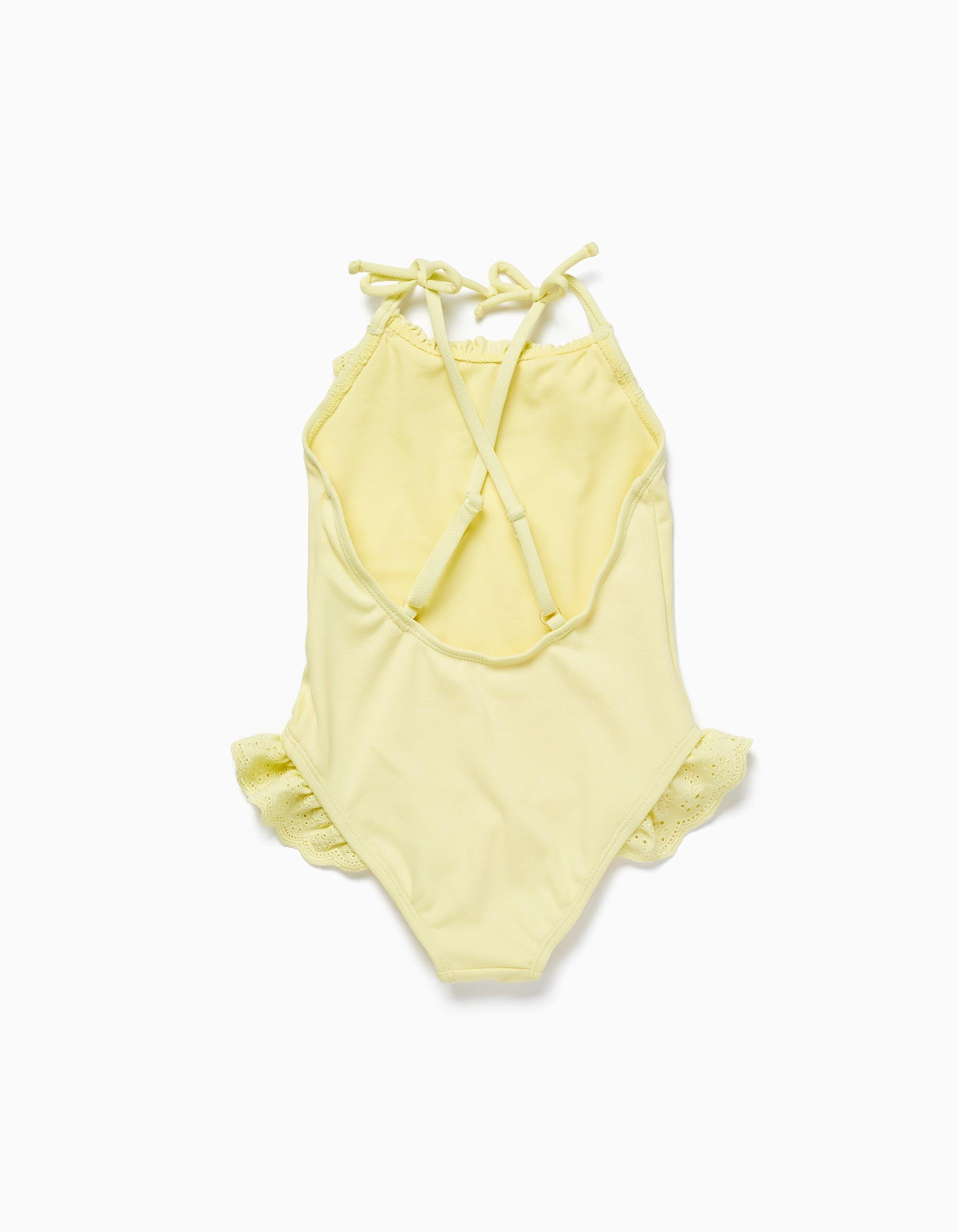 Yellow swimsuit for girls, with a touch of elasticity for greater freedom of movement. With lining for greater comfort. Ends decorated with english embroidery. Elasticated hems. Adjustable cross straps with decorative bow. A delicate and lovely piece for the little girls beach days.