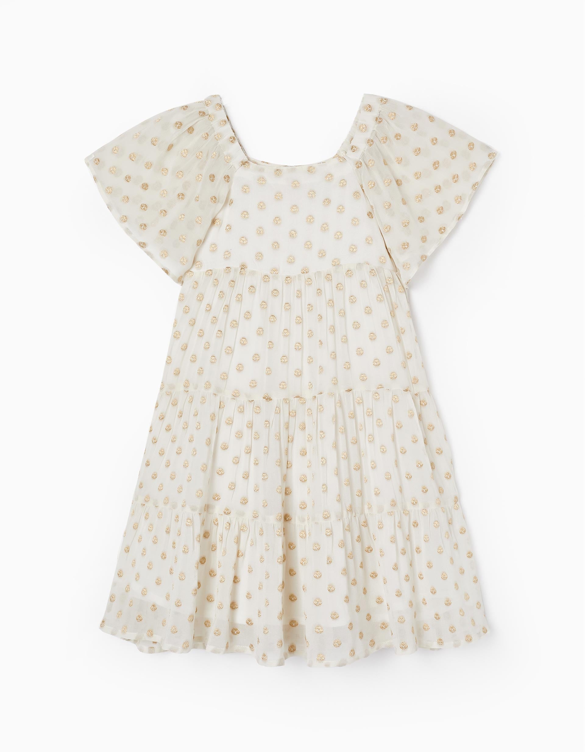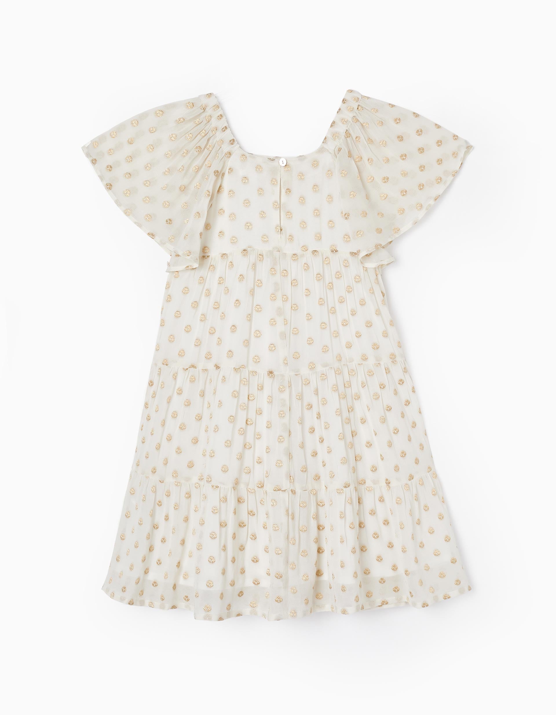 Beige short-sleeved dress for girls. Tulle outer layer with golden flower pattern. 100% cotton lining. Square and stretchy neckline. Fastens with a button at the back. An elegant and refined garment, perfect for special occasions.
