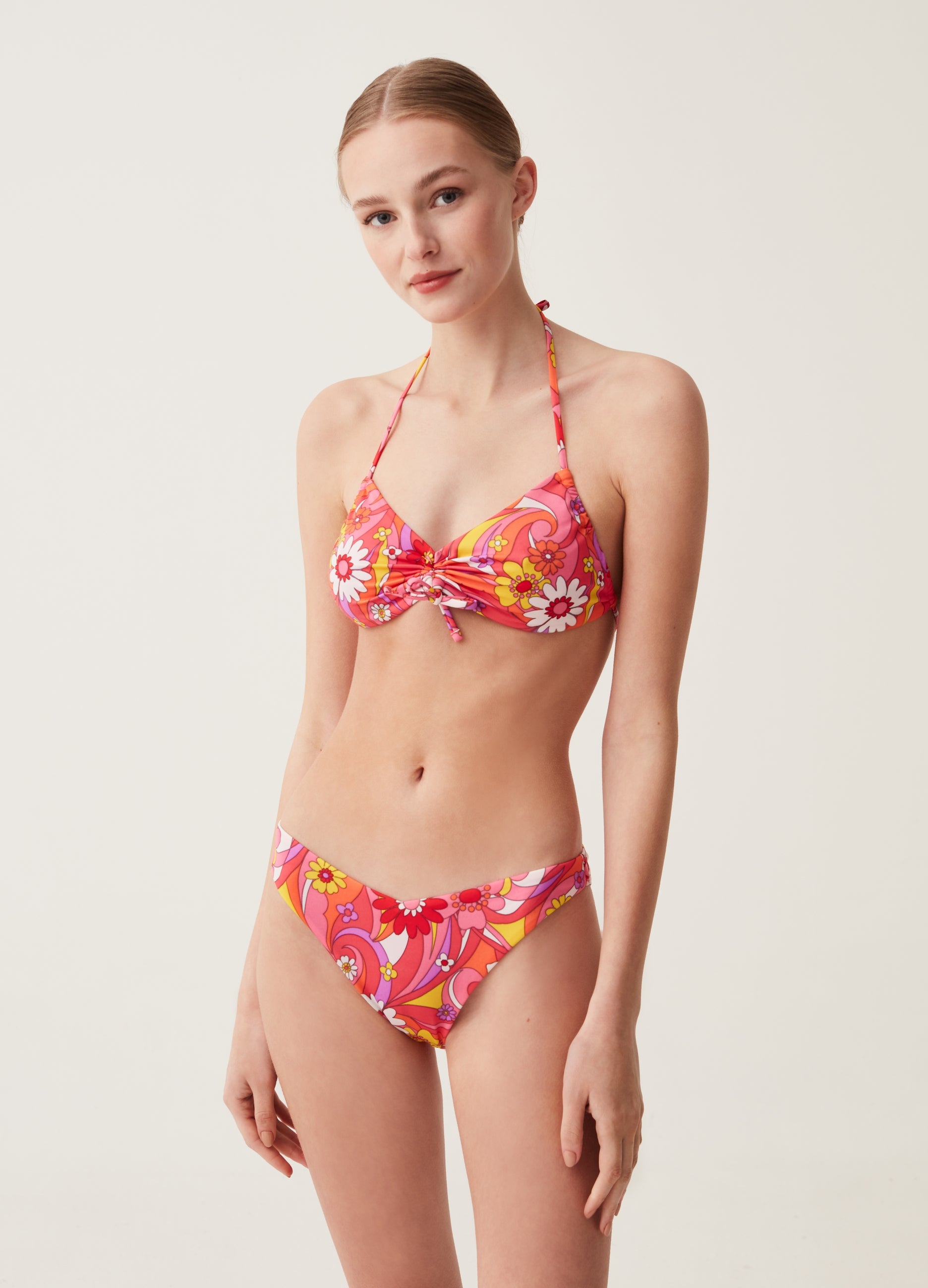 Bandeau bikini top with all-over floral print. V-neck with tie. Spaghetti neck and back ties.