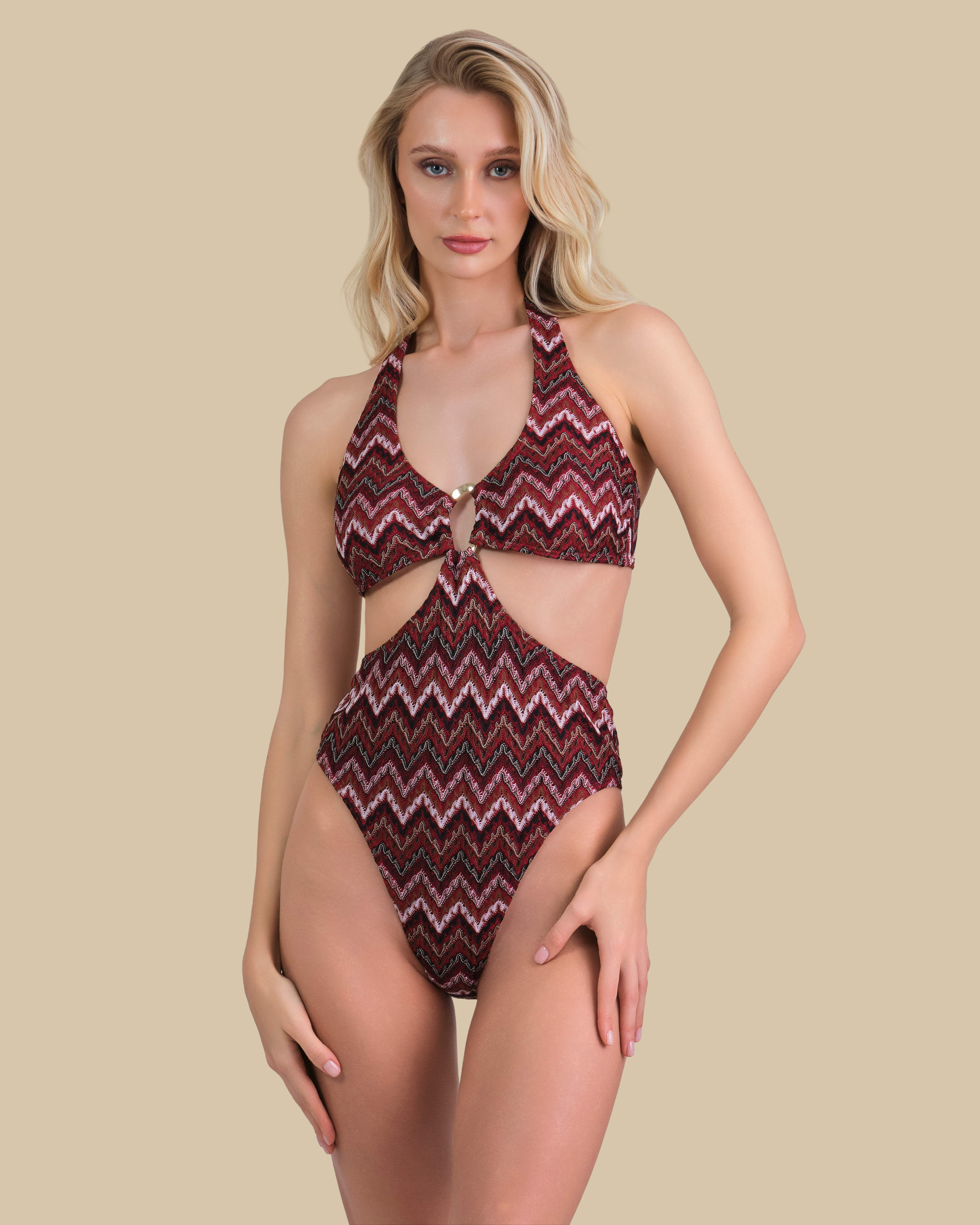 Make a statement in this zig zag print cut out swimsuit from Isla & Evie. Featuring a halter neckline, gold tone ring at the front, and a flattering open back, it blends bold style with a sculpted fit.