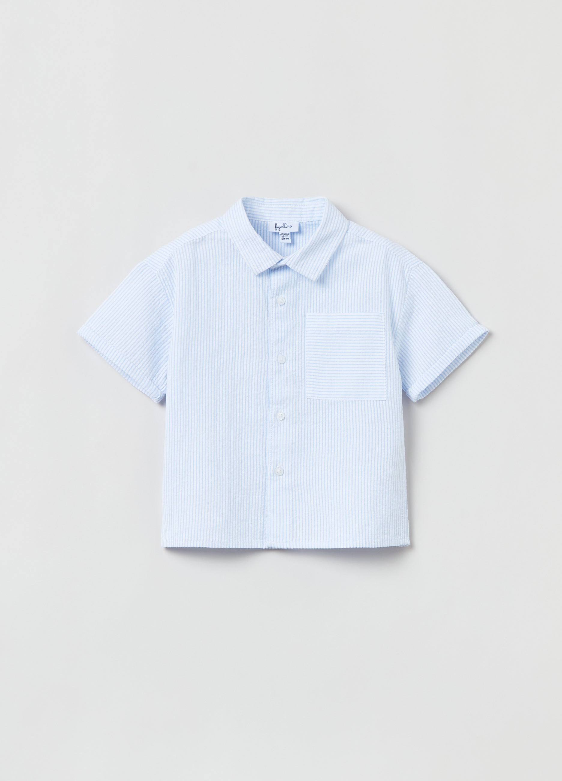 Shirt in 100% cotton seersucker. Yarn-dyed striped pattern. Bluff collar and yoke on the back. Patch pocket on the chest. Button fastening.
