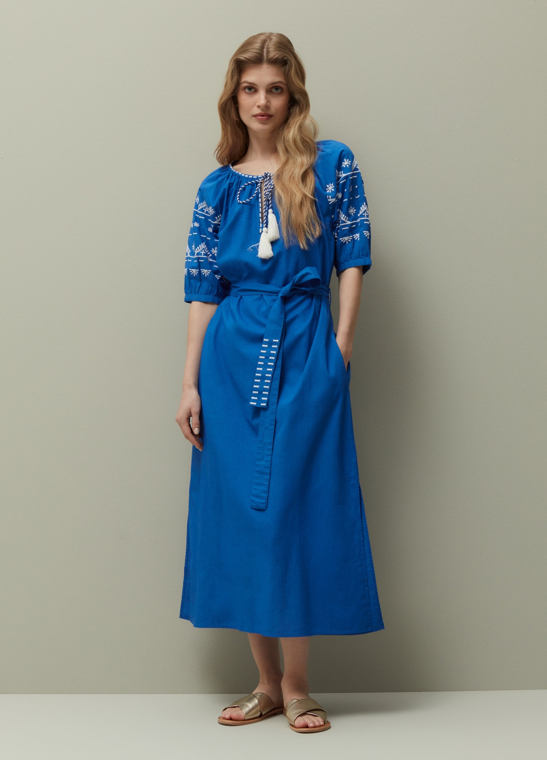PIOMBO 100% cotton midi dress with ethnic embroidery. V-neck with tie and tassels. Elbow-length raglan puff sleeves. Knotted waist belt. Side splits.