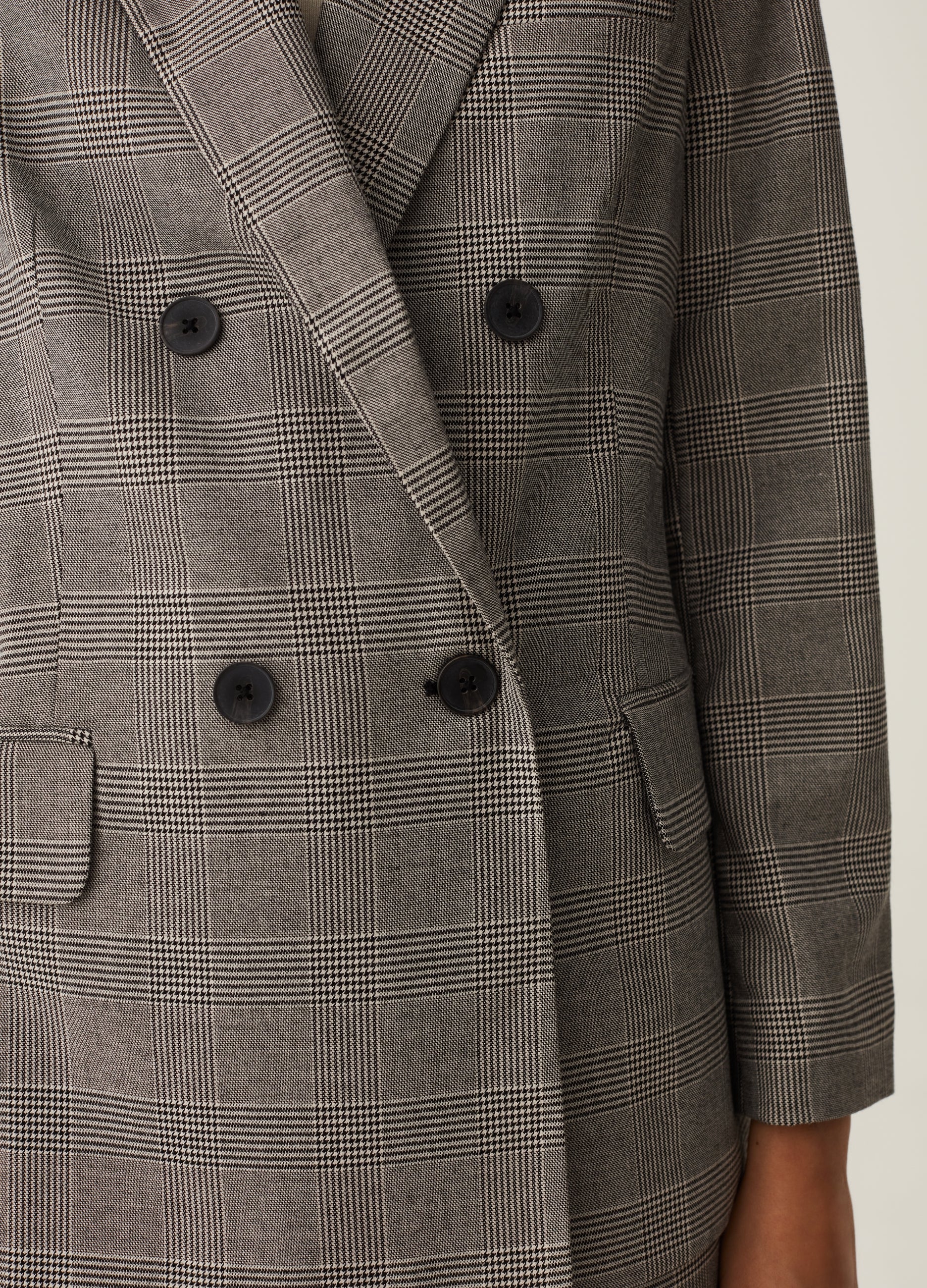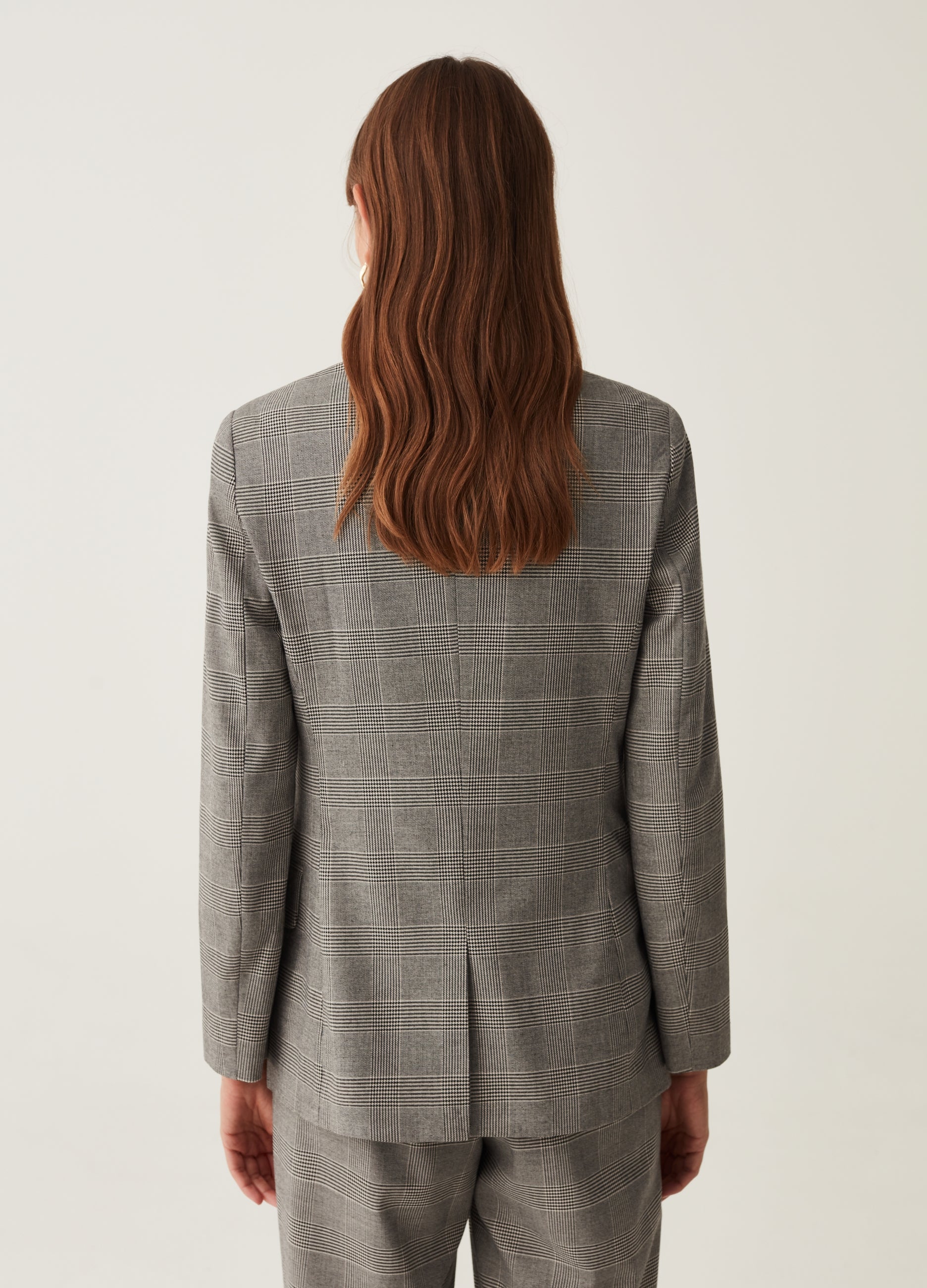 Blazer in stretch viscose blend fabric. Pattern with Prince of Wales check design. Two horizontal pockets with flap. Back vent. Double-breasted button fastening. Matching trousers available.