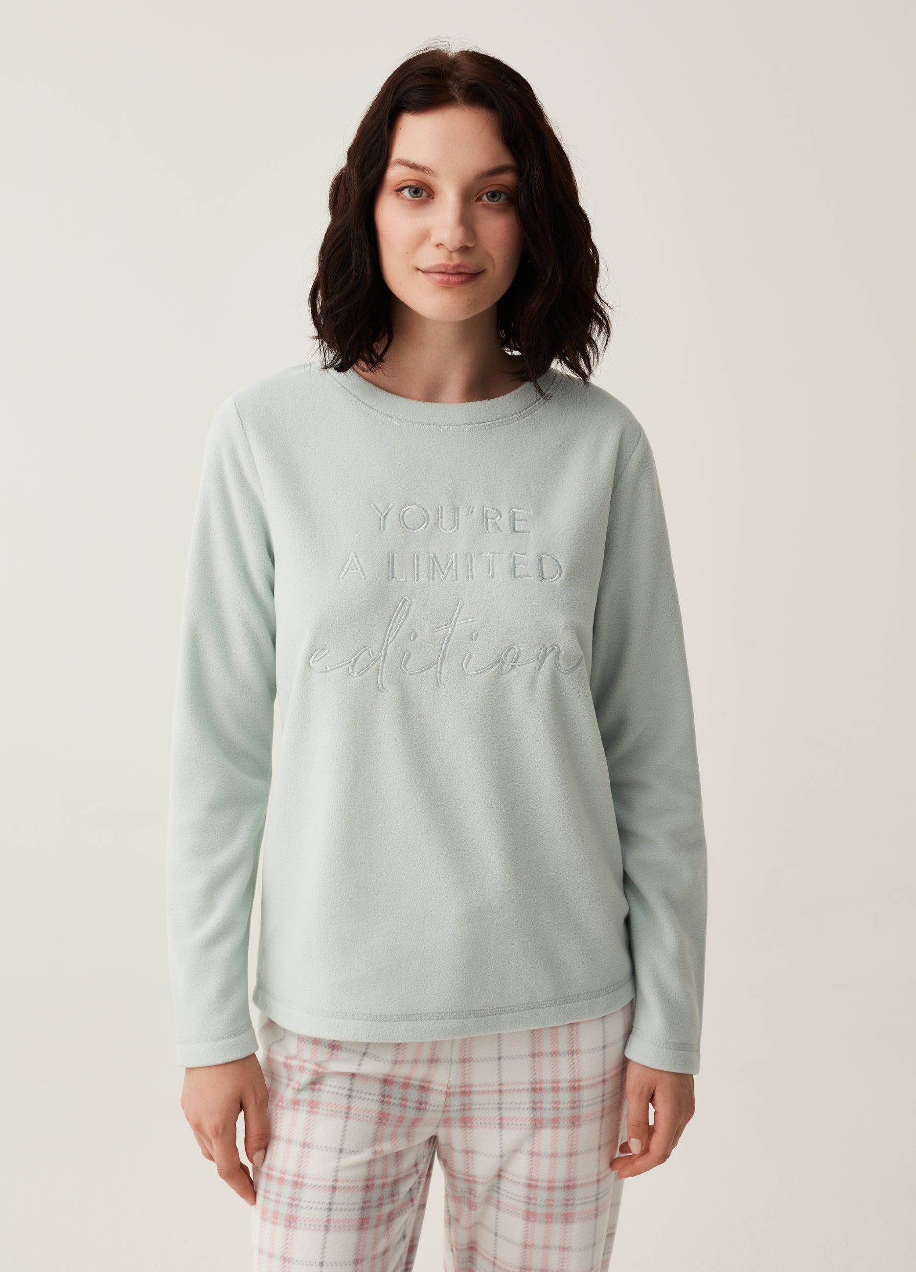 Fleece pyjama top with lettering embroidery. Round neck. Long sleeves.