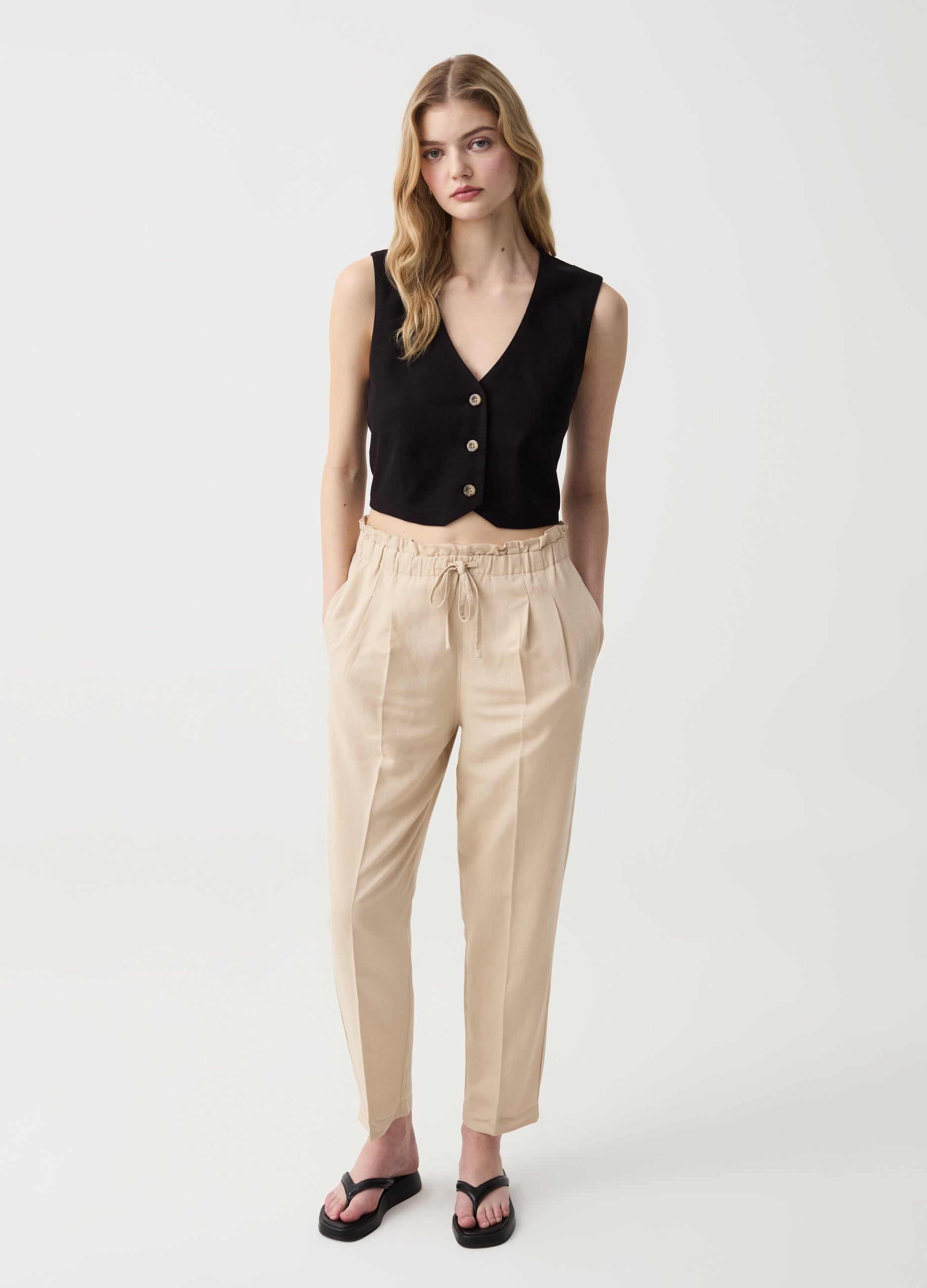 Cigarette trousers in FSC®-certified sustainable viscose and linen with drawstring. Waist with side darts. Two vertical pockets and two welt pockets on the back.