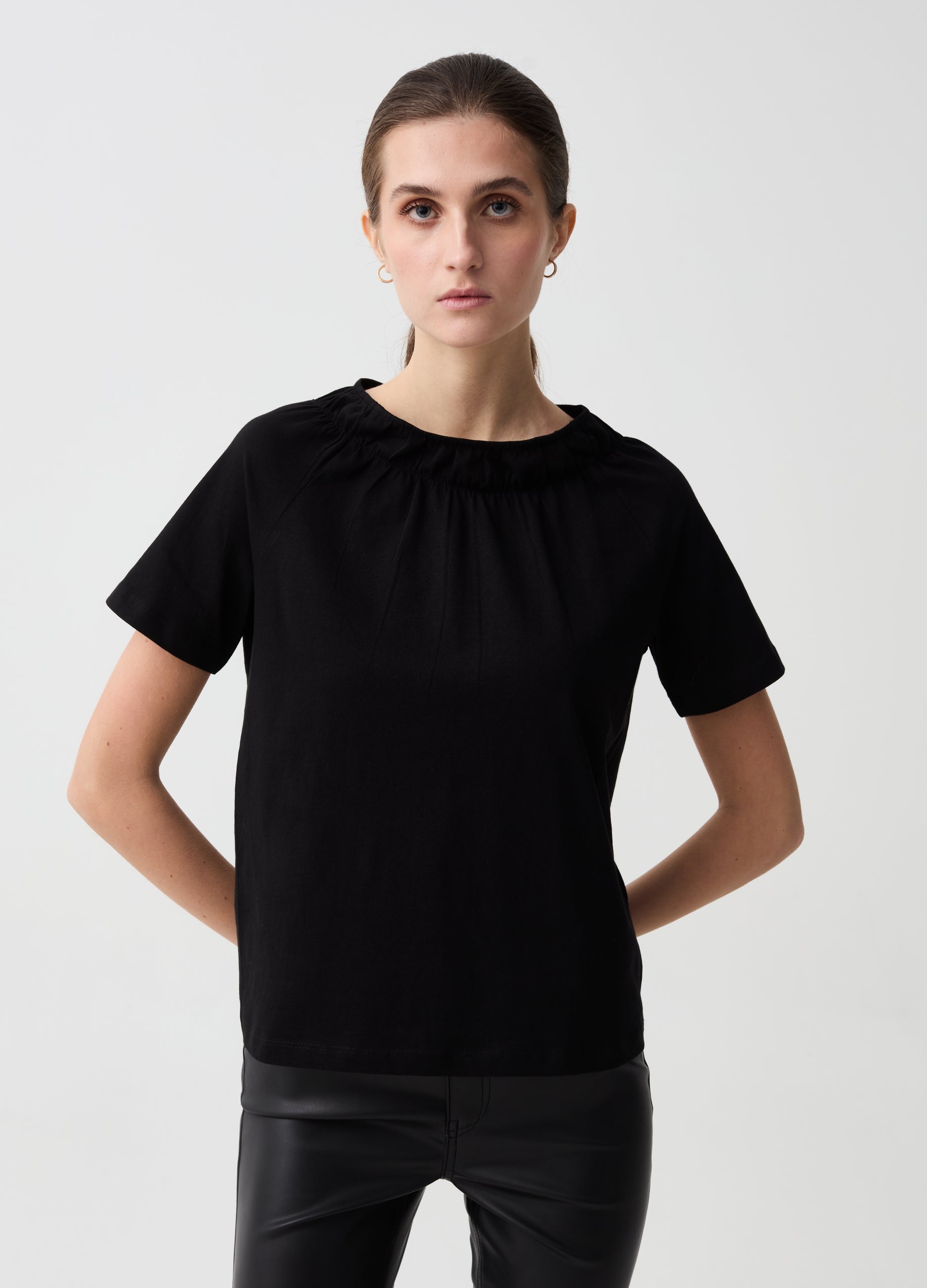 Solid colour 100% cotton T-shirt. Mock neck with pleating. Raglan sleeves.
