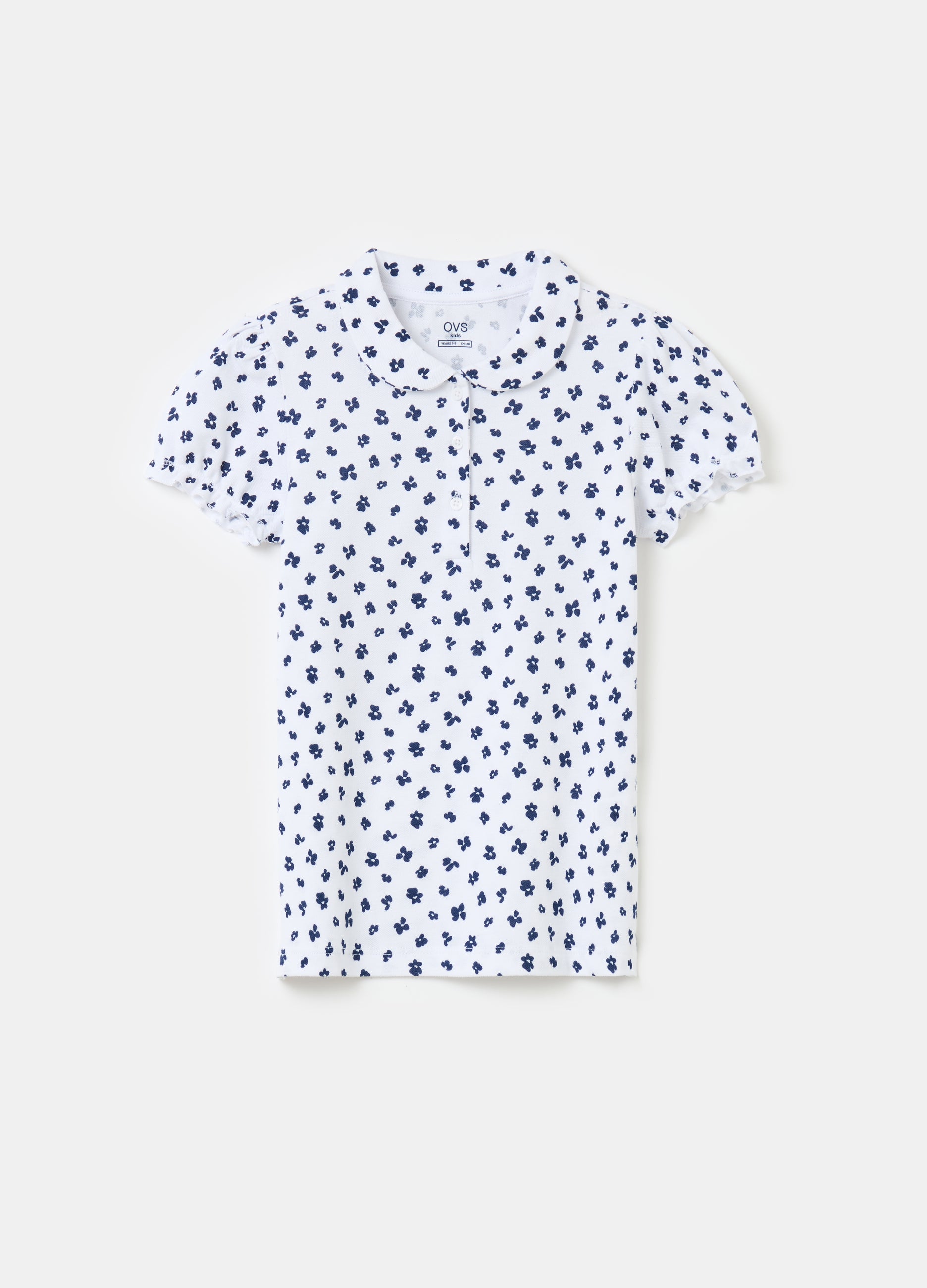 100% cotton piquet polo shirt with all-over small flowers print. Rounded collar. Short puffed sleeves.