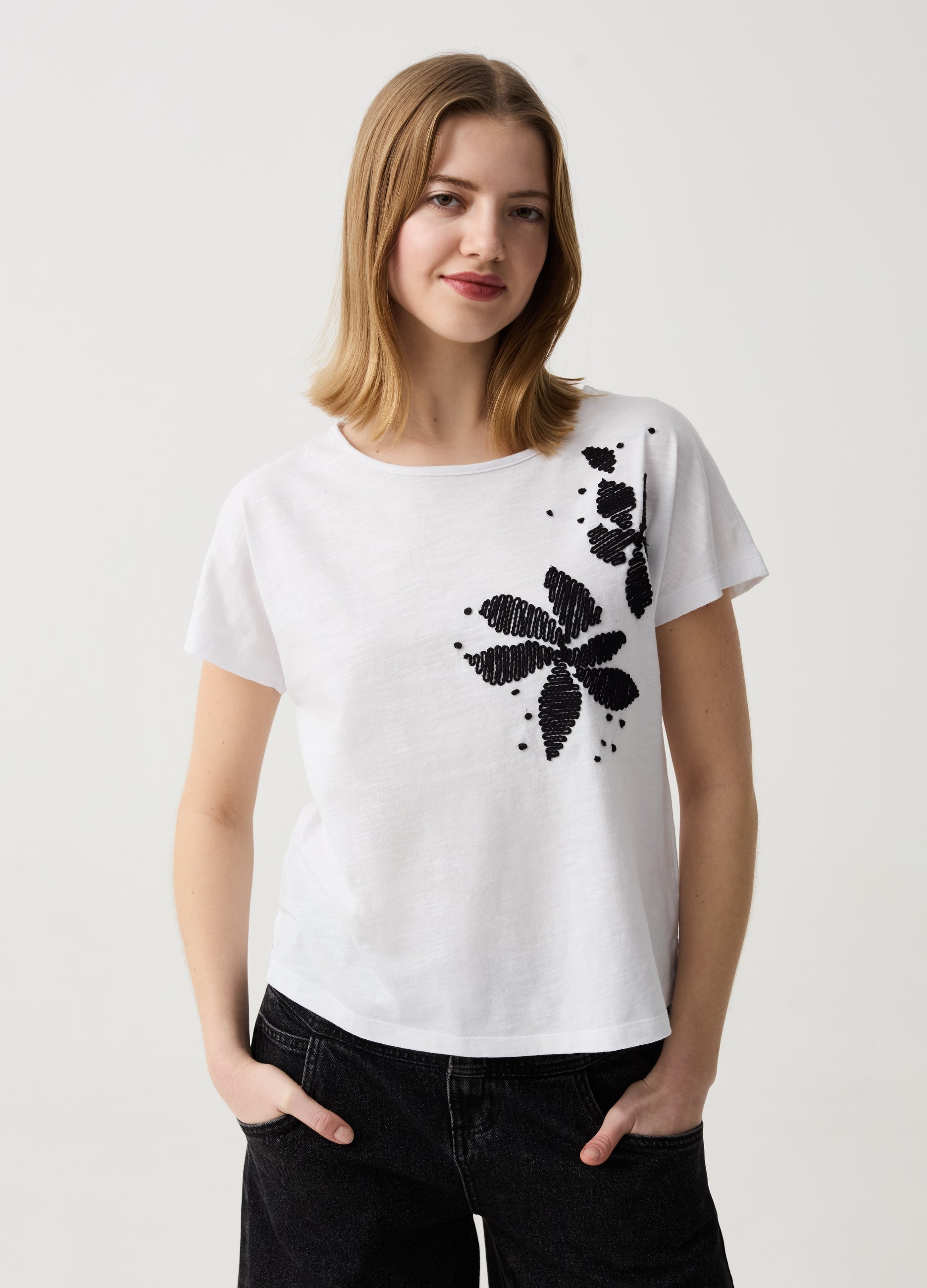Ovs Cotton T-Shirt With Flowers Embroidery