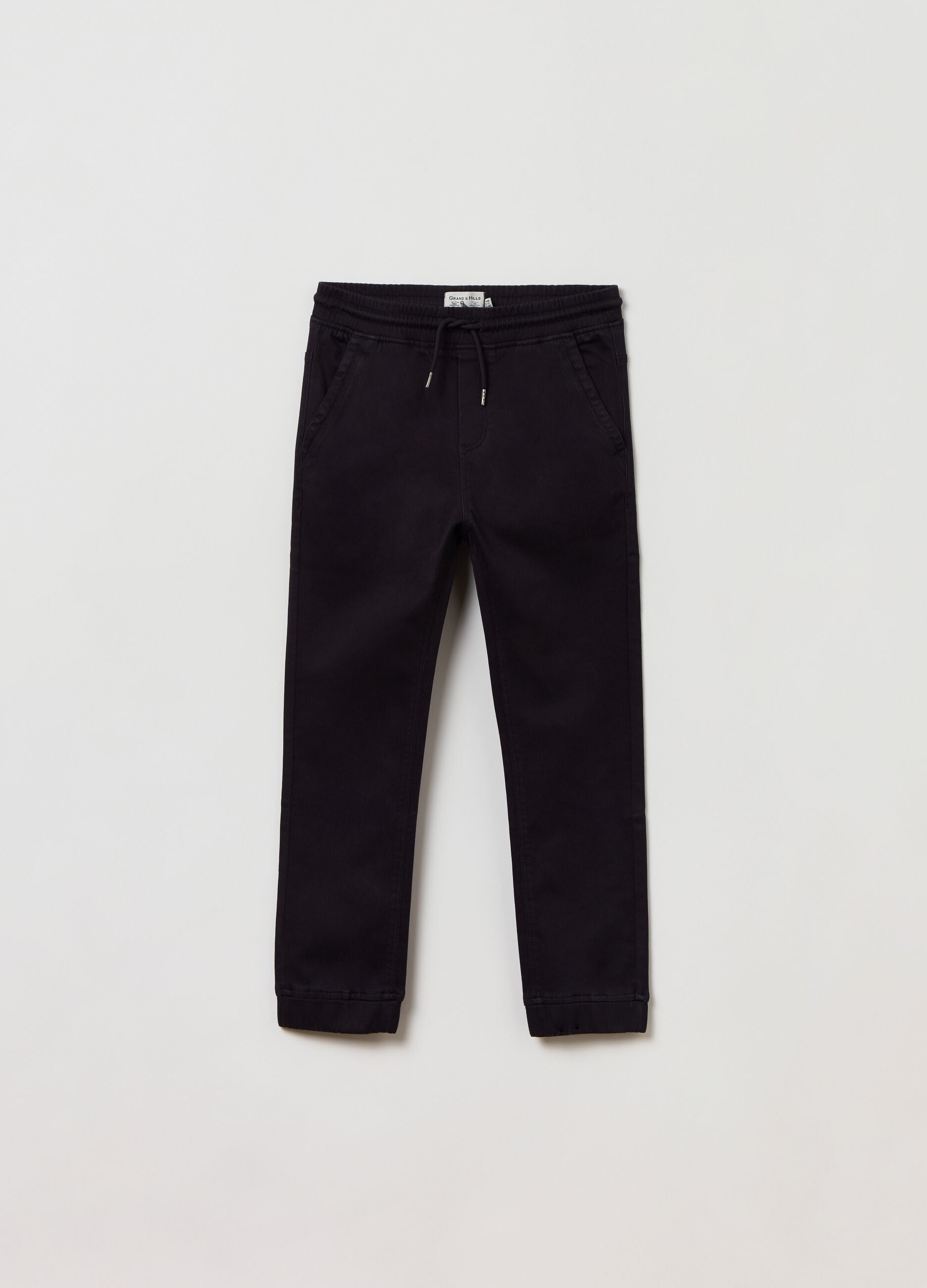 Cuff-hem trousers in stretch cotton French terry (non-brushed fleece lining) with drawstring. Two slant pockets and two patch pockets on the back. Elastic waist band and ankles.