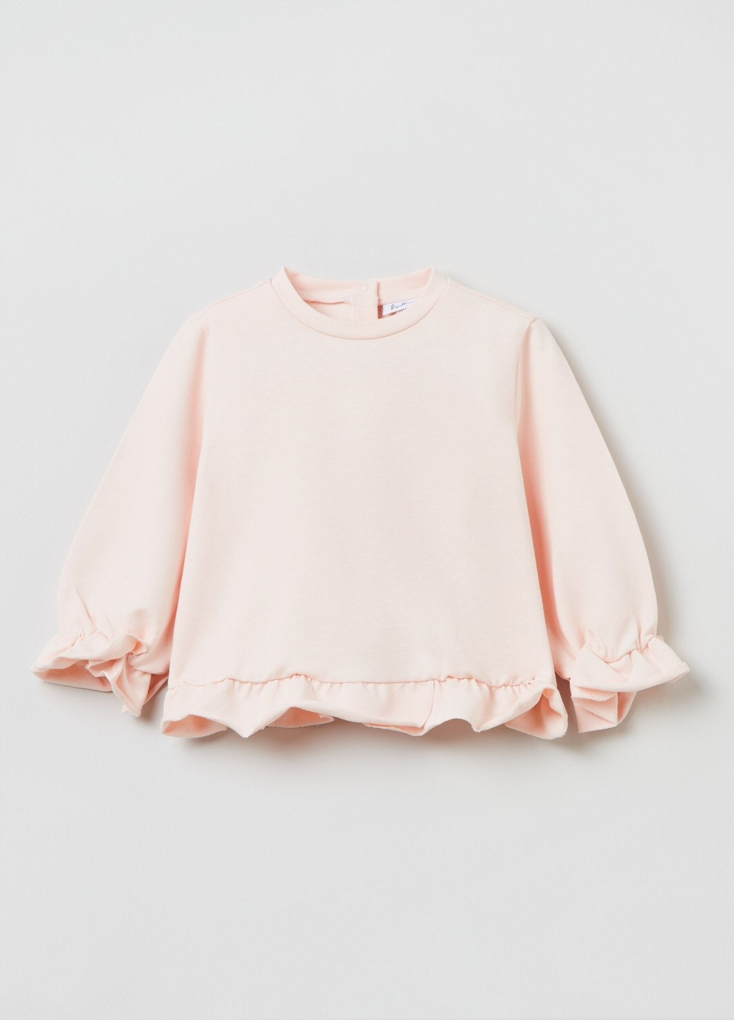 Stretch cotton French Terry sweatshirt (non-brushed lining). Round neck and snap buttons on the back. Cuffs and hem with raw-edge flounces.