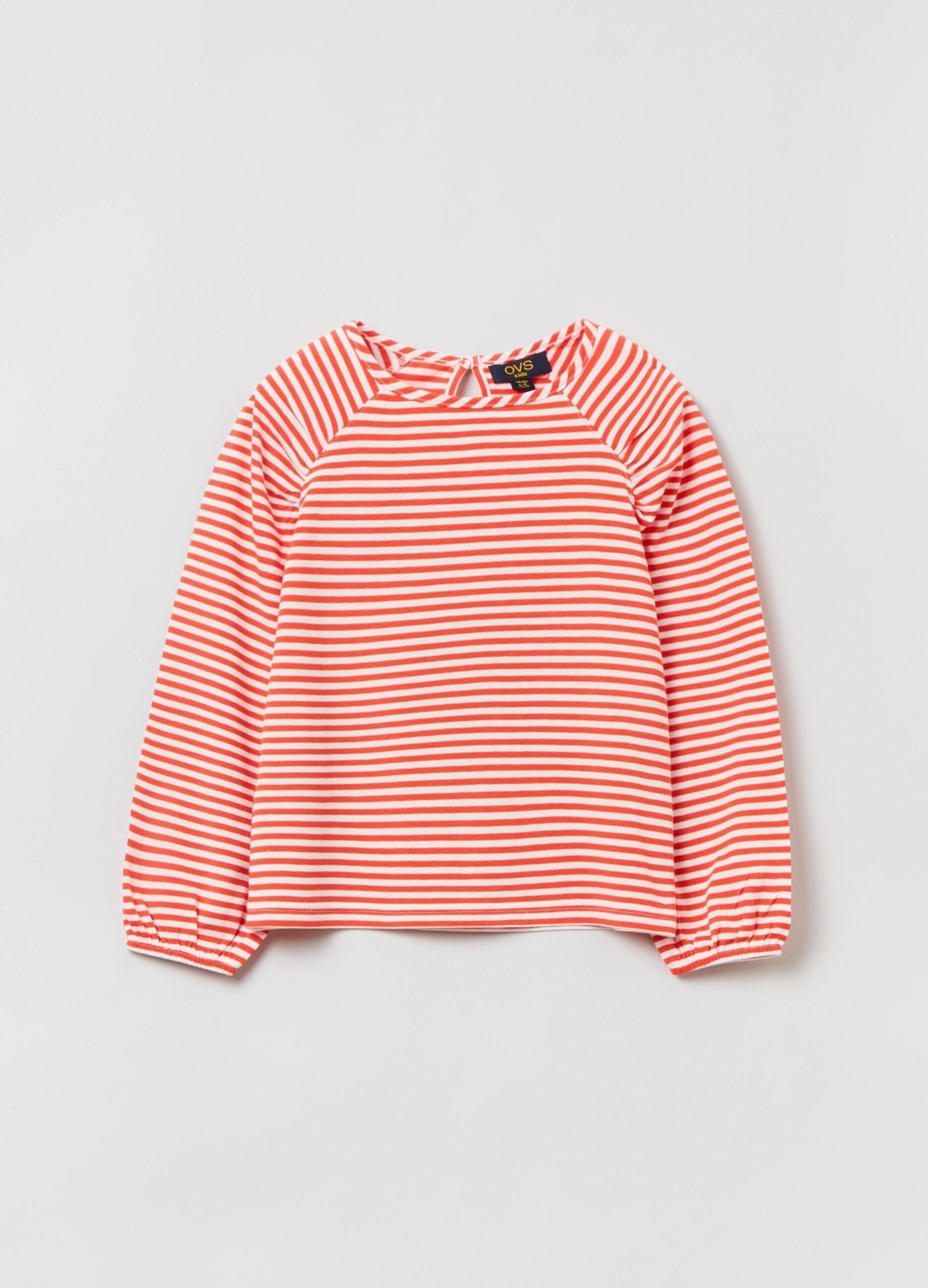 Stretch cotton striped T-shirt with round neck. Puff raglan sleeves with elasticated cuffs. Keyhole opening with button fastening on the back.