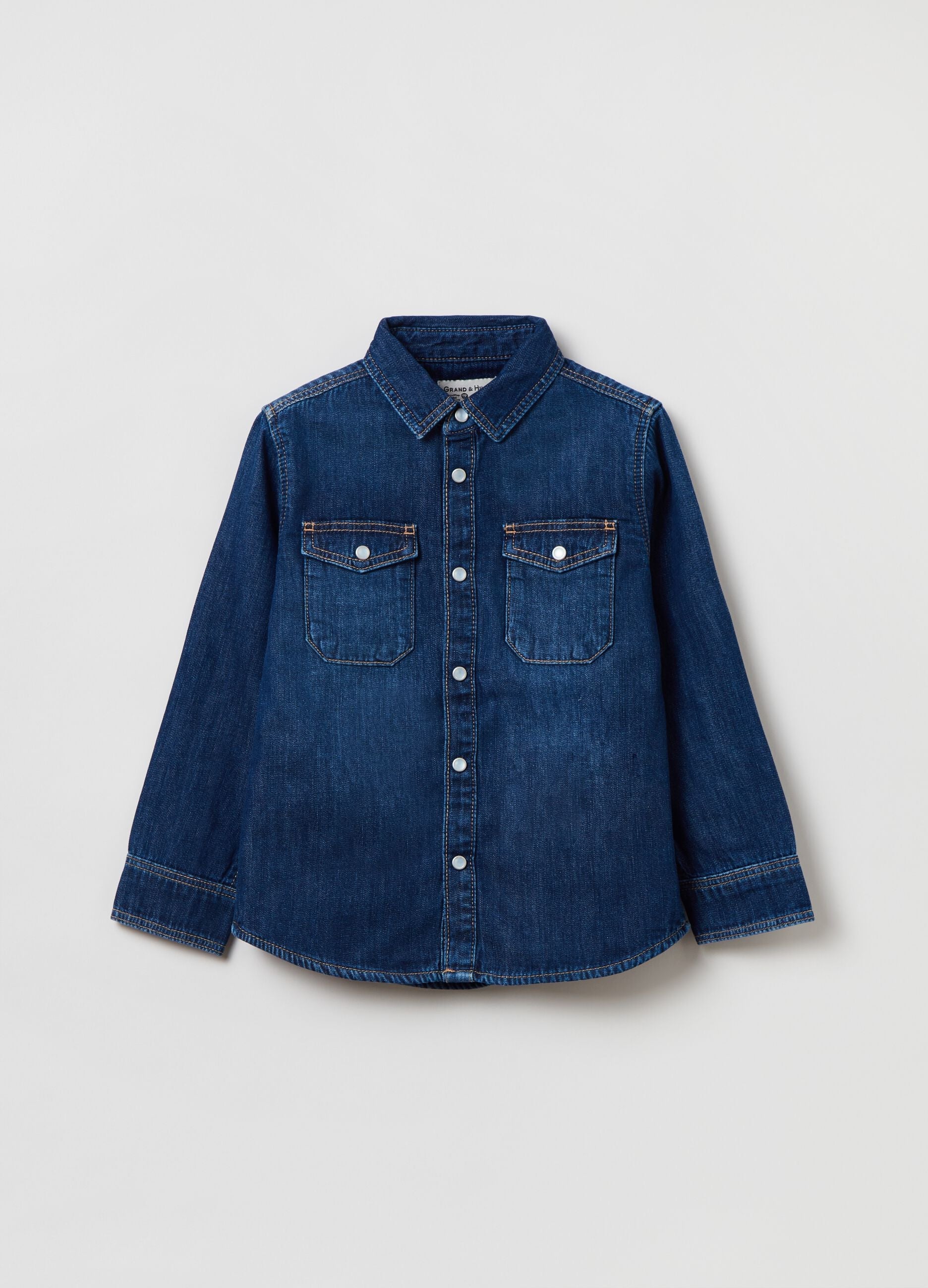 Shirt in 100% cotton denim Cotton and viscose lining. Cutaway collar. Yoke and vertical stitching on the back. Two pockets with flap and button on the chest. Snap button fastening.
