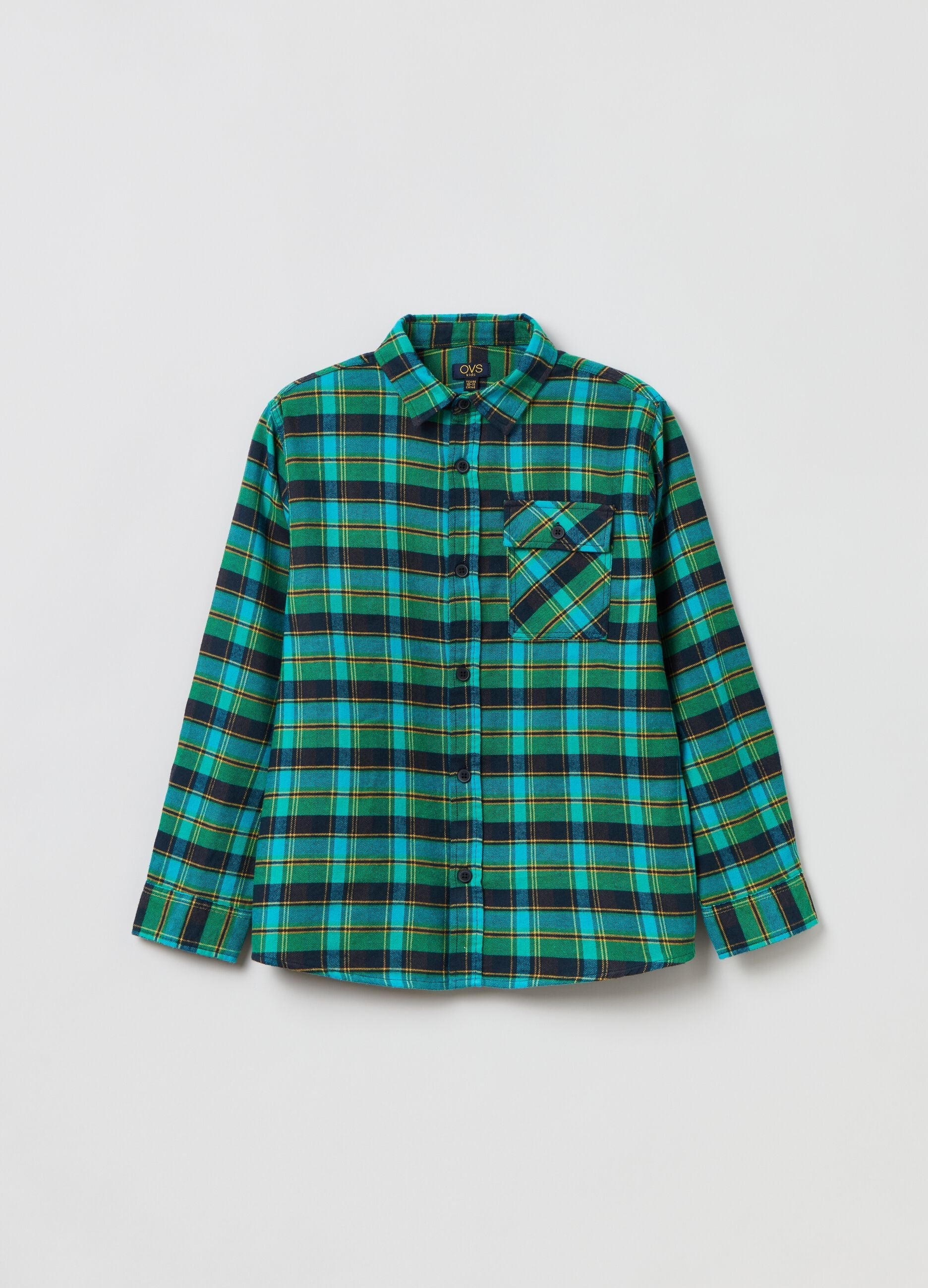100% cotton shirt with check print. Bluff collar. Yoke on the back. Patch pocket with button and flap on the chest. Button fastening.