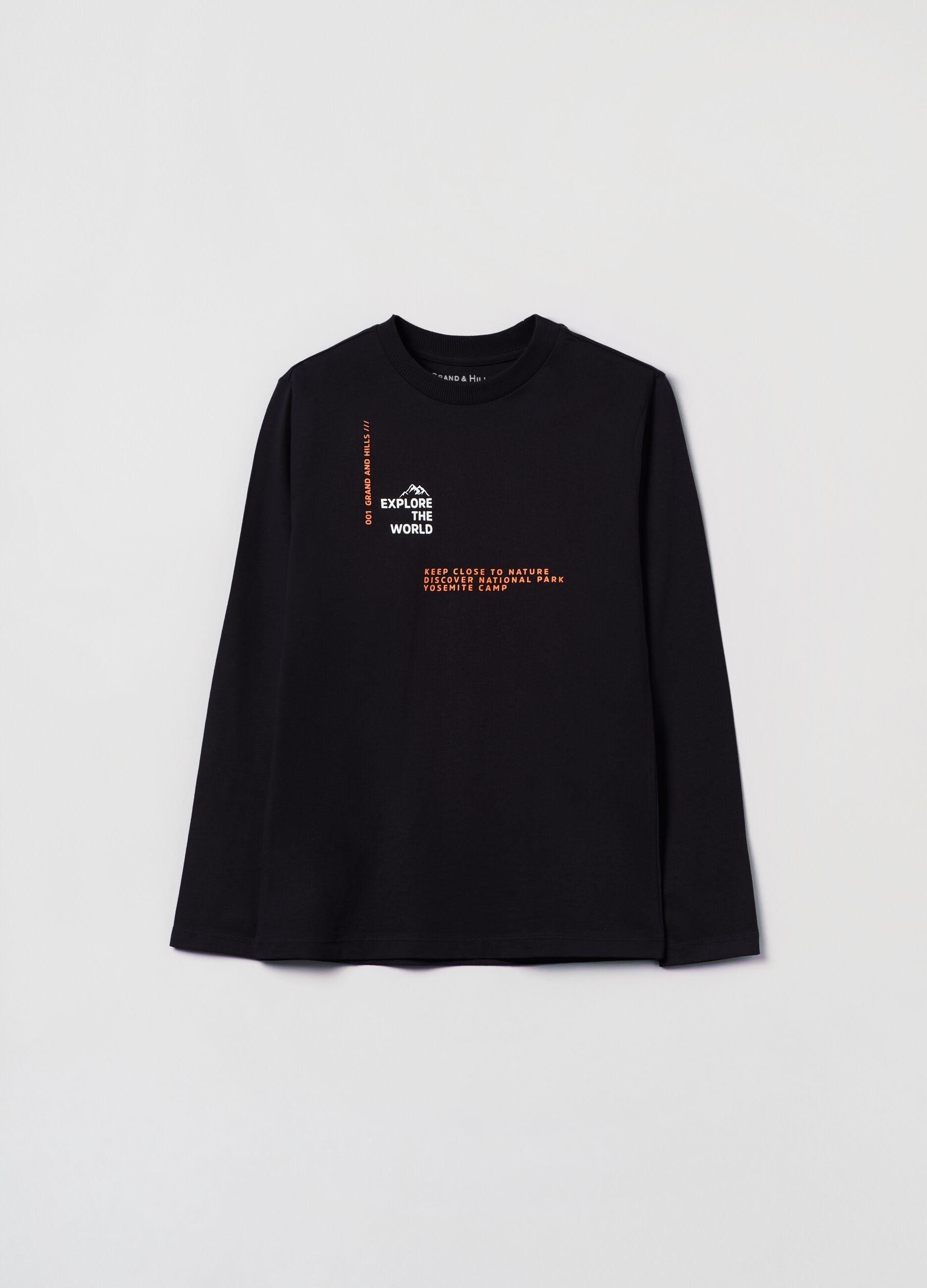 100% cotton T-shirt with long sleeves. Round ribbed neck. Printed lettering on the front.
