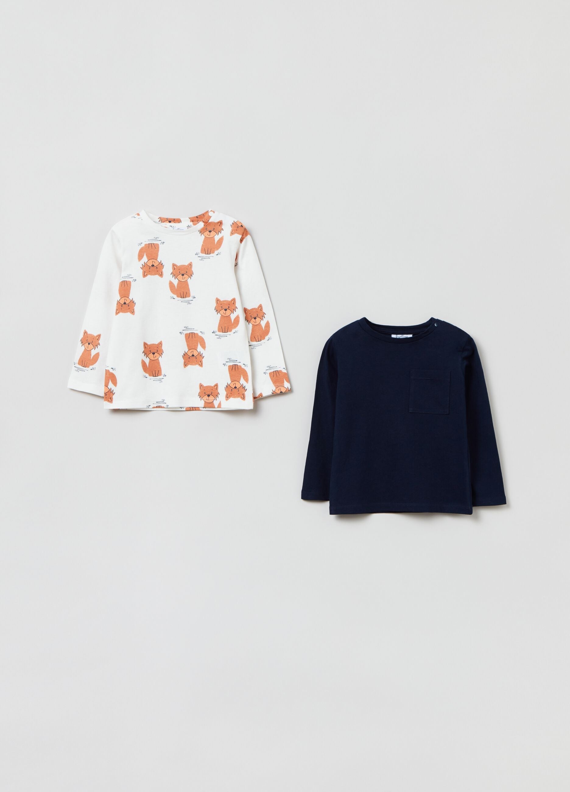Set of two 100% cotton, long-sleeved T-shirts. Round neck with snap buttons on the shoulder. One T-shirt with all-over foxes print and one solid colour T-shirt with patch pocket on the chest.