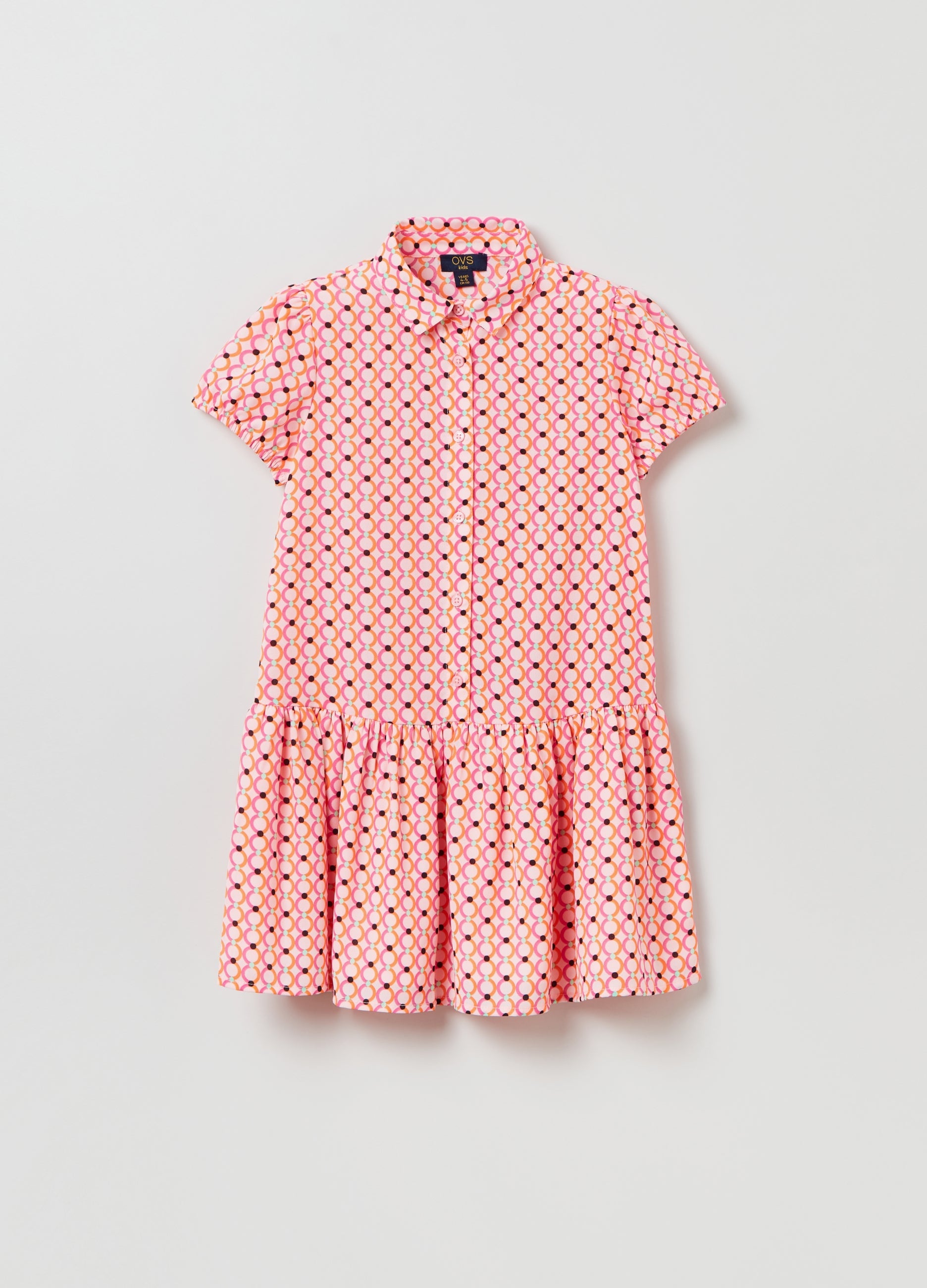 Shirt dress with peplum hem. Short puff sleeves with elasticated cuffs. All-over geometric print.