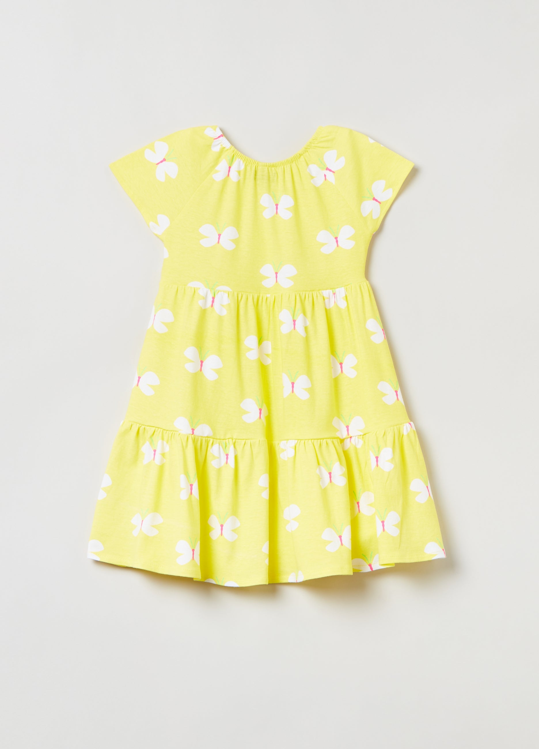 Dress in 100% cotton with flounce. Elasticated round neck. Short raglan sleeves. All-over butterfly print.