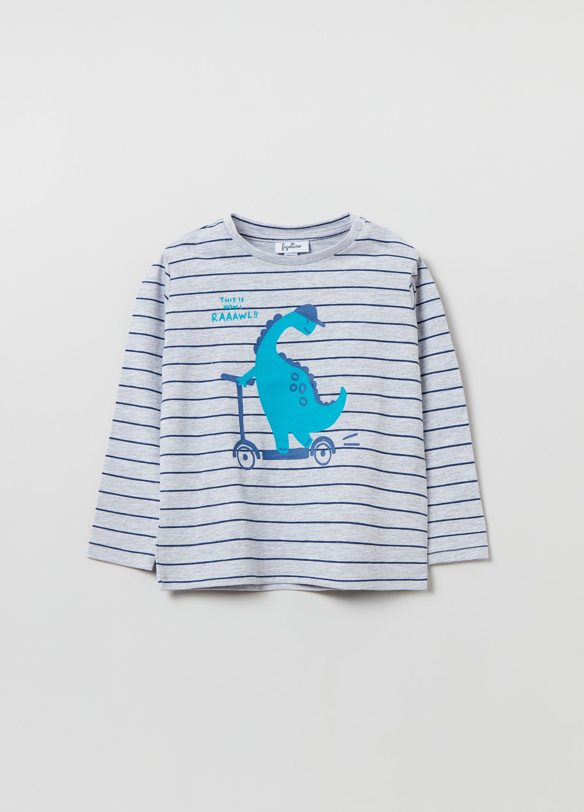Mã©Lange Cotton And Viscose T-Shirt With Long Sleeves. Round Neck With Snap Buttons On The Shoulder. Striped Pattern. Dinosaur On Scooter And Lettering Print On The Front.