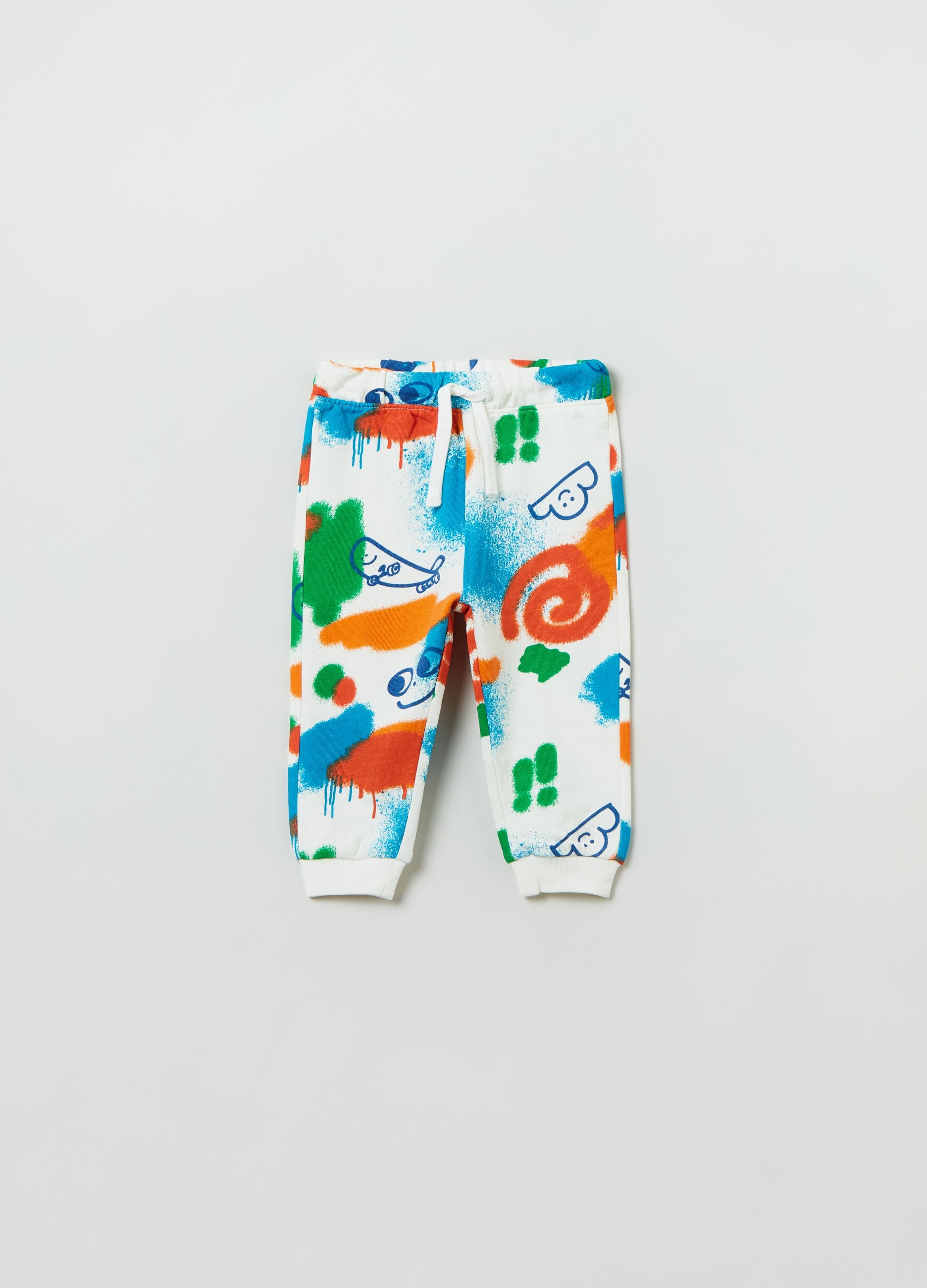 Fleece Joggers In 100% Cotton With Drawstring. All-Over Paint-Effect Marks And Skateboard Print. Ribbed Ankle Cuffs.