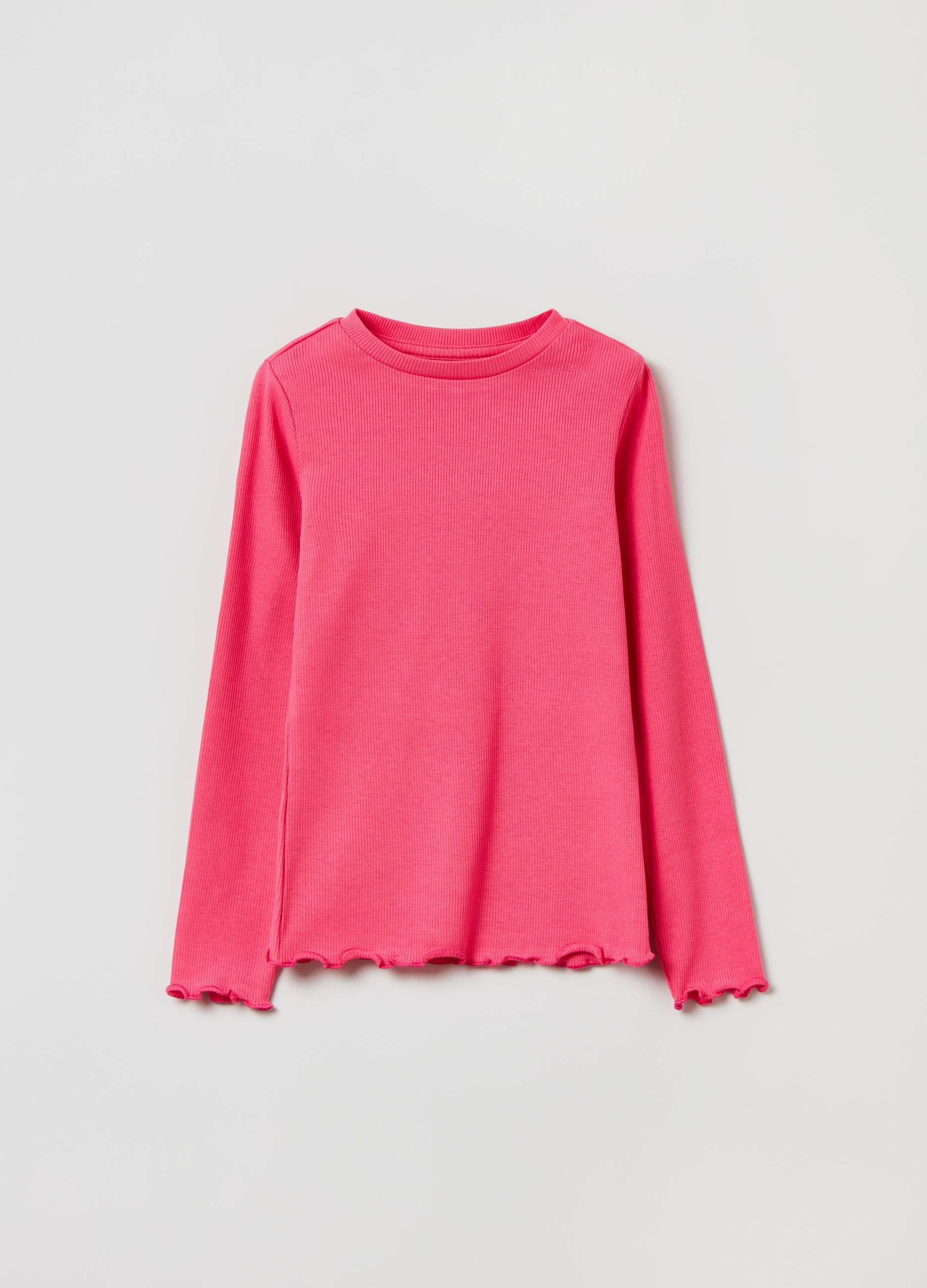 Slim Ribbed Stretch Cotton T-Shirt. Round Neck. Long Sleeves. Wavy Base And Cuffs.