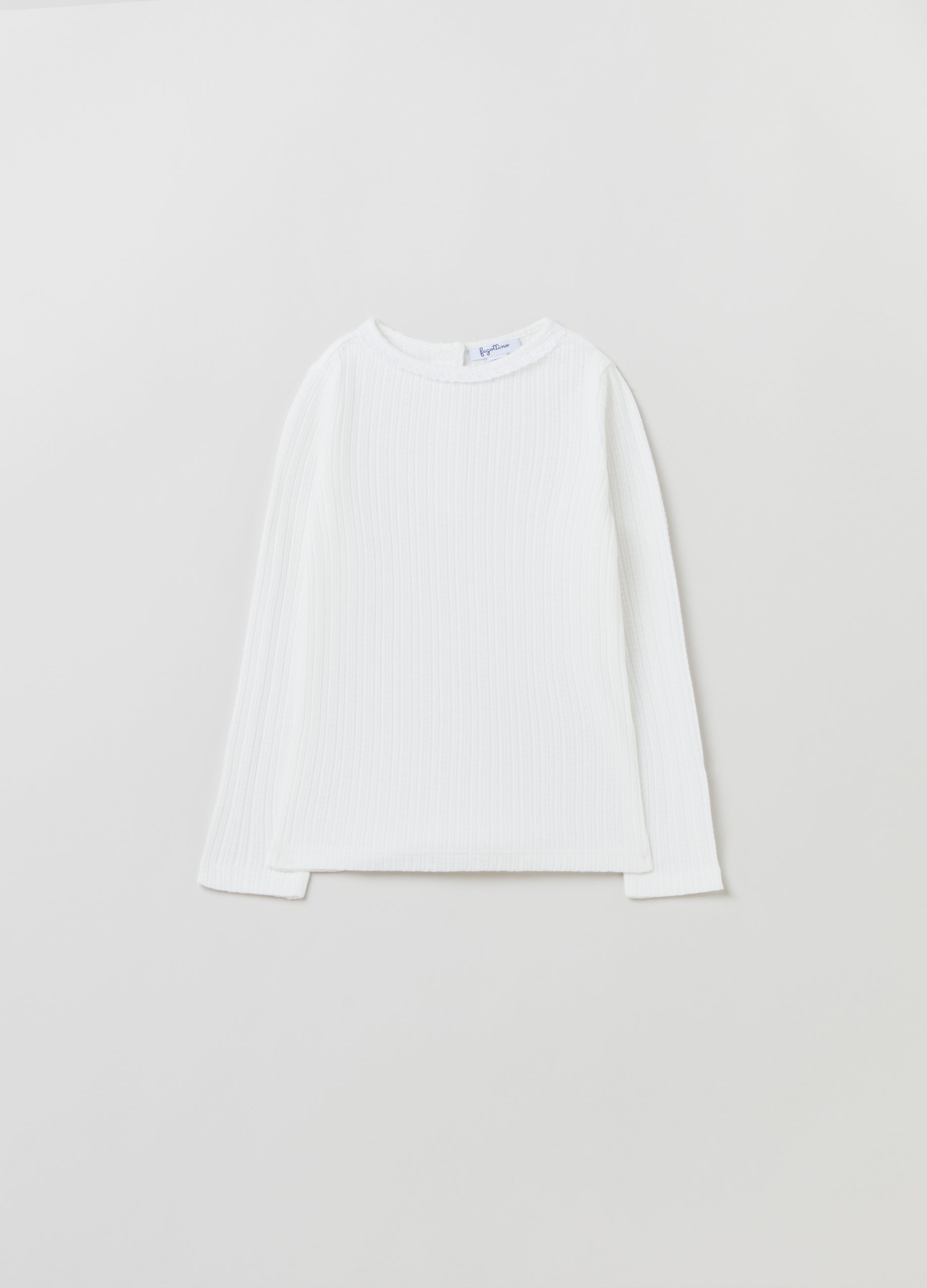 Long-Sleeved Ribbed T-Shirt In 100% Cotton Blend With Pointelle Detailing. Round Neck With Braid Trim. Snap Button Fastening On The Back.
