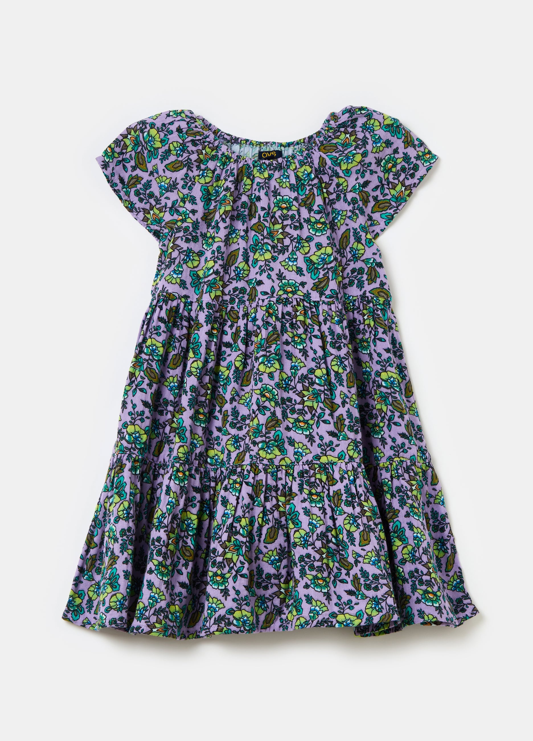 Dress in 100% cotton with flounce. Elasticated round neck. Floral pattern. Capped sleeves.