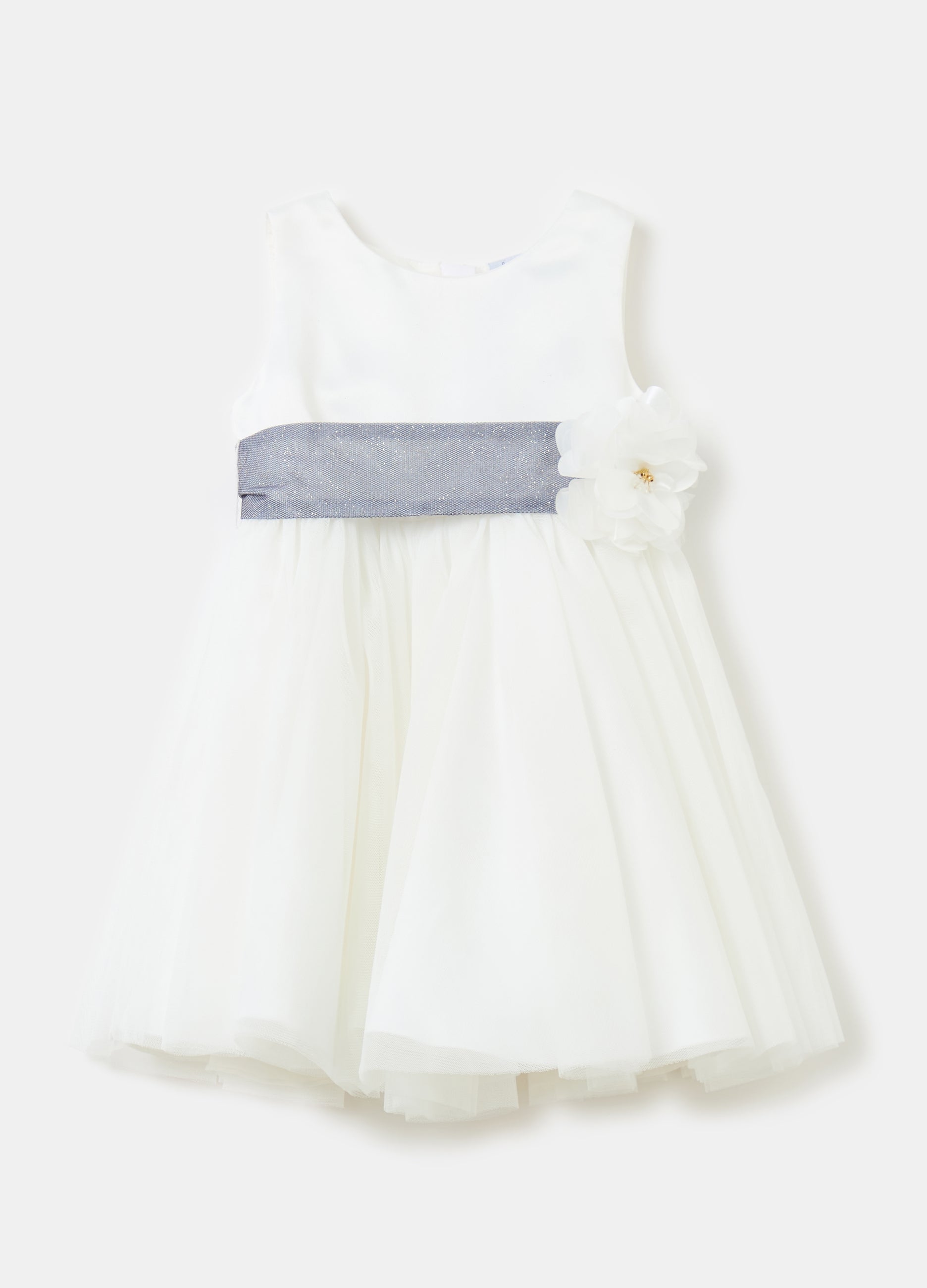 Sleeveless Dress With Tulle Skirt. 100% Cotton Lining. Round Neck. Tulle Band With Glitter And Flower Tied At The Waist. Zip Fastening On The Back.