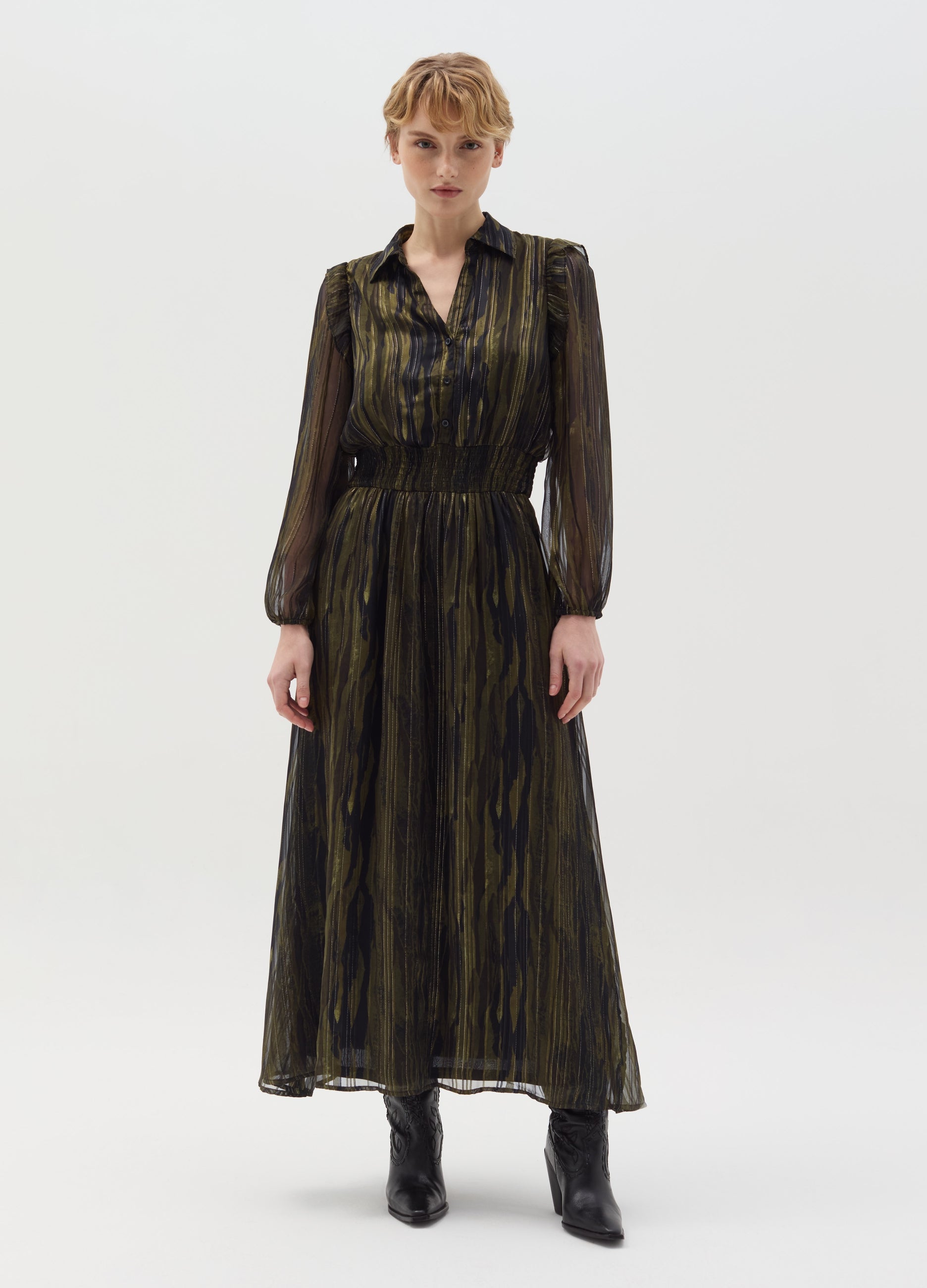 Long Shirt Dress In Fil Coupã© With Lurex And Striped Design. Long Sleeves And Flounce On The Arm Opening. Elasticated Cuffs. Smock Stitch At The Waist. Front Button Fastening.