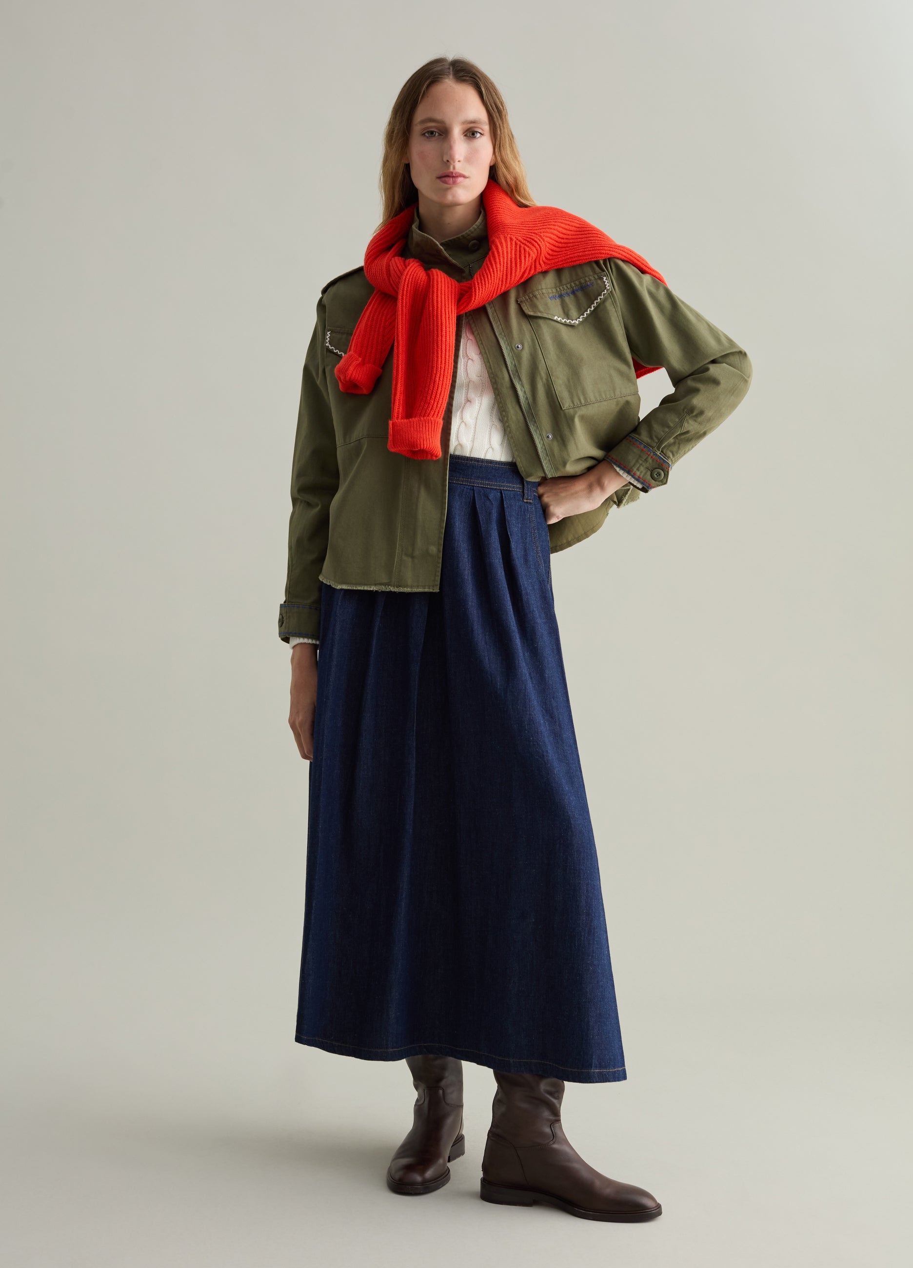Piombo Long Full Skirt In Cotton, Linen And Viscose Denim. High Waist. Concealed Inner Hooks And Zip Closure.