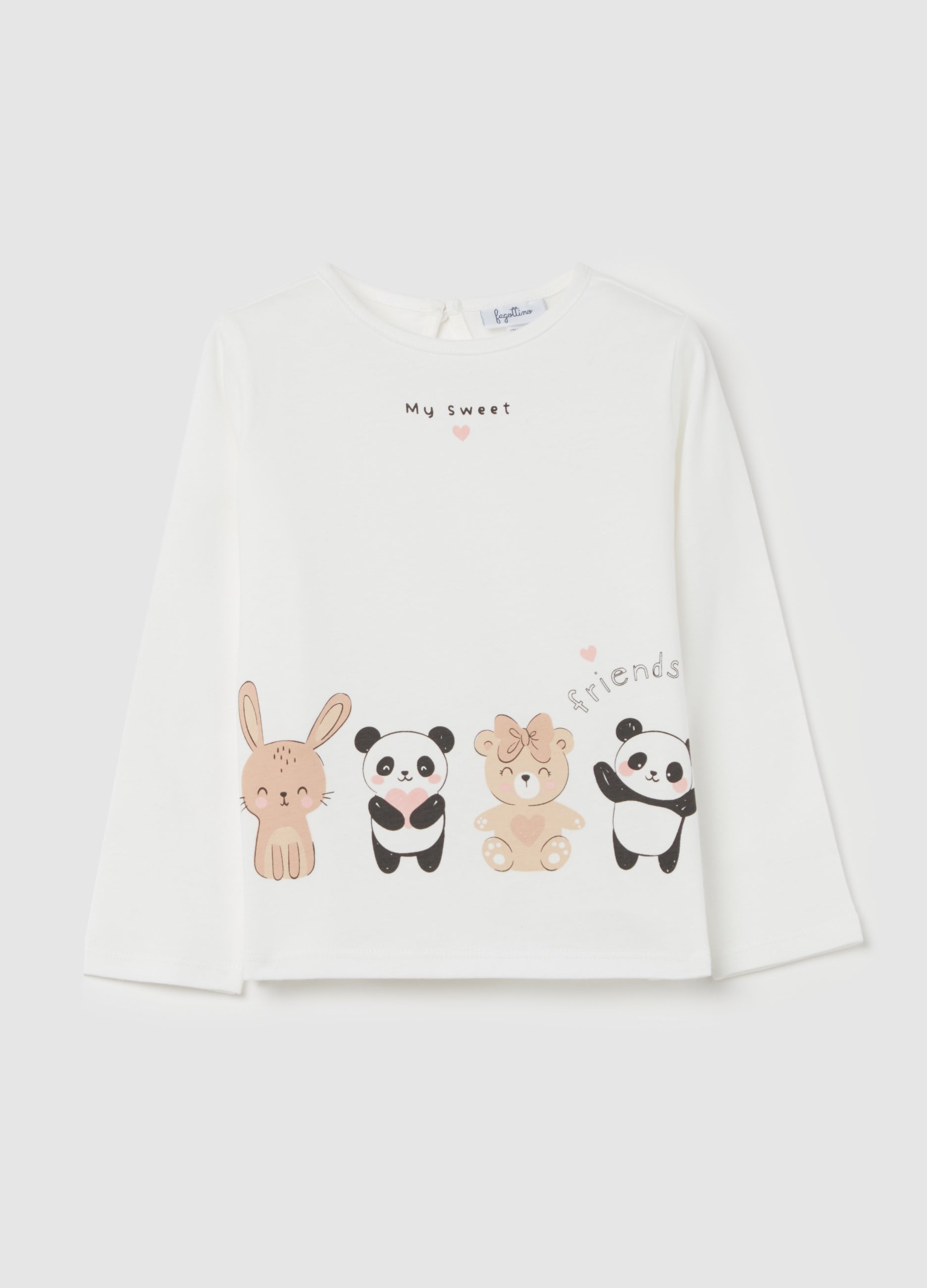 100% cotton T-shirt with long sleeves. Round neck. Animals print and ''Sweetness Party” lettering on the front. Keyhole opening with button fastening on the back.