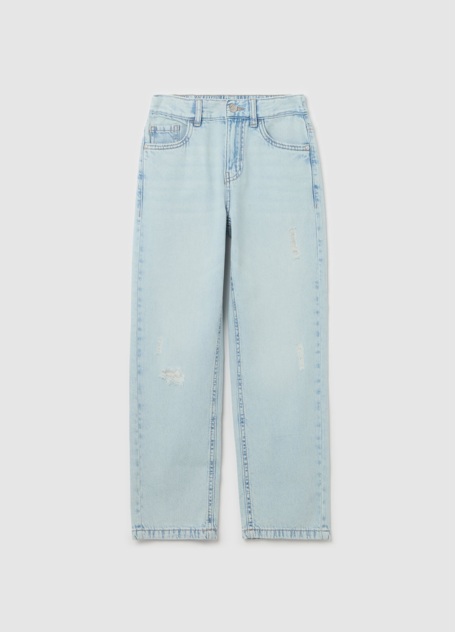 Mum-fit jeans in 100% cotton with abrasions on the front. Waist elasticated on the back. Five pockets. Zip and button fastening.