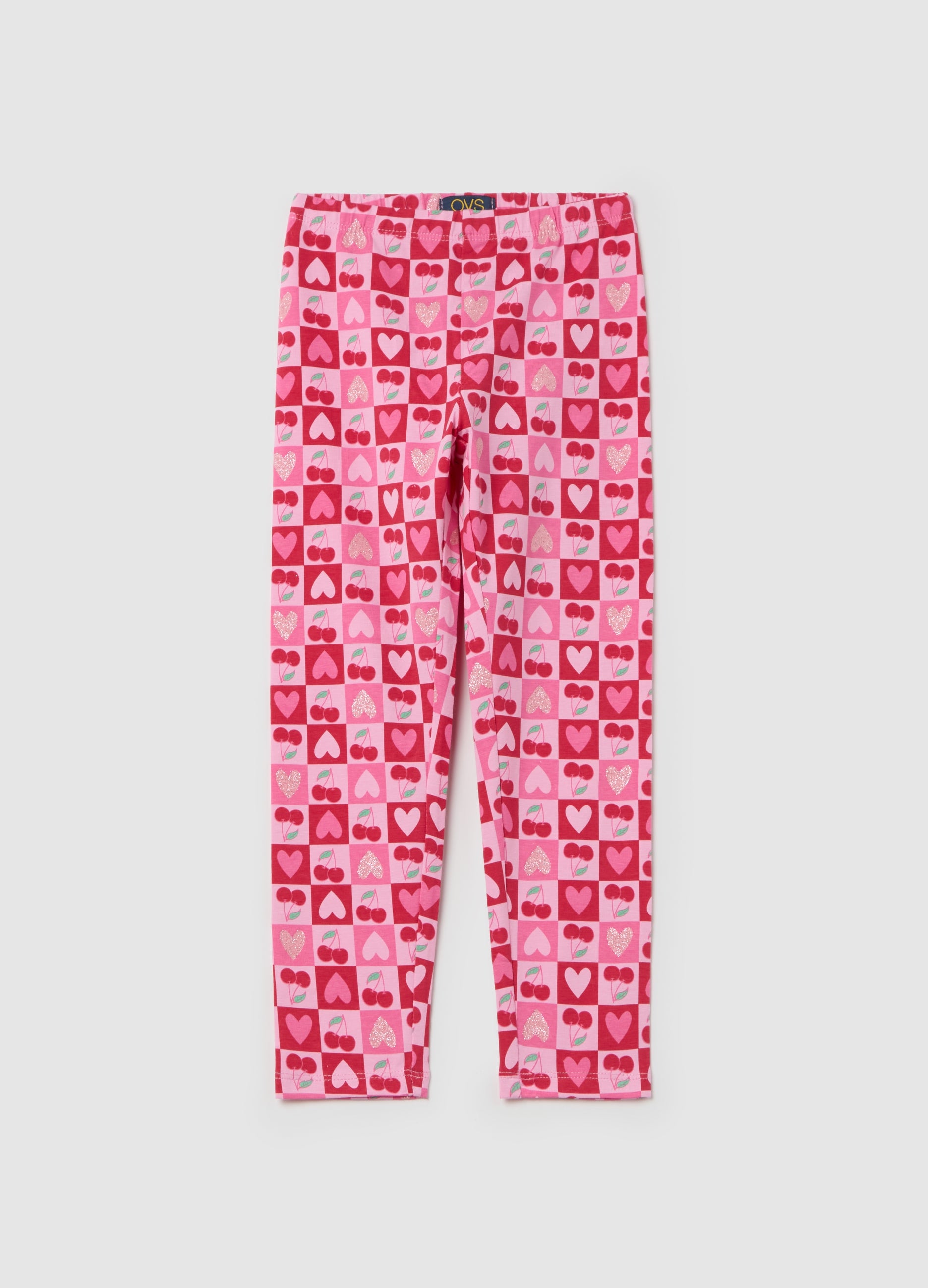 Stretch cotton leggings. Elasticated waist. Check pattern with all-over glitter hearts and cherries print.