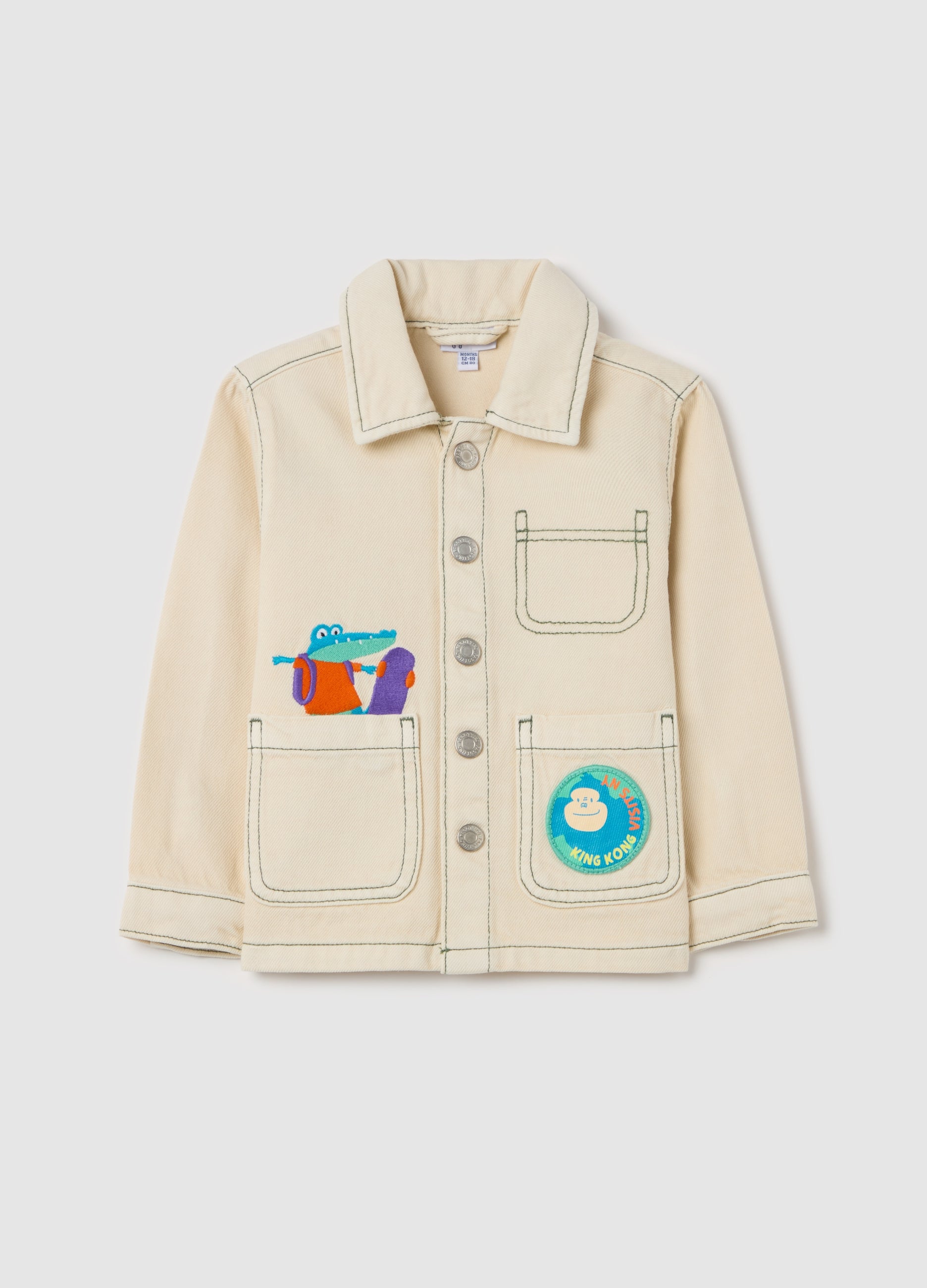 100% Cotton Shacket With Contrast Stitching. Yoke On The Back. Embroidered Pocket On The Side. Two Pockets With Crocodile Skater Embroidery And Gorilla Patches On The Front. Snap-Button Fastening.