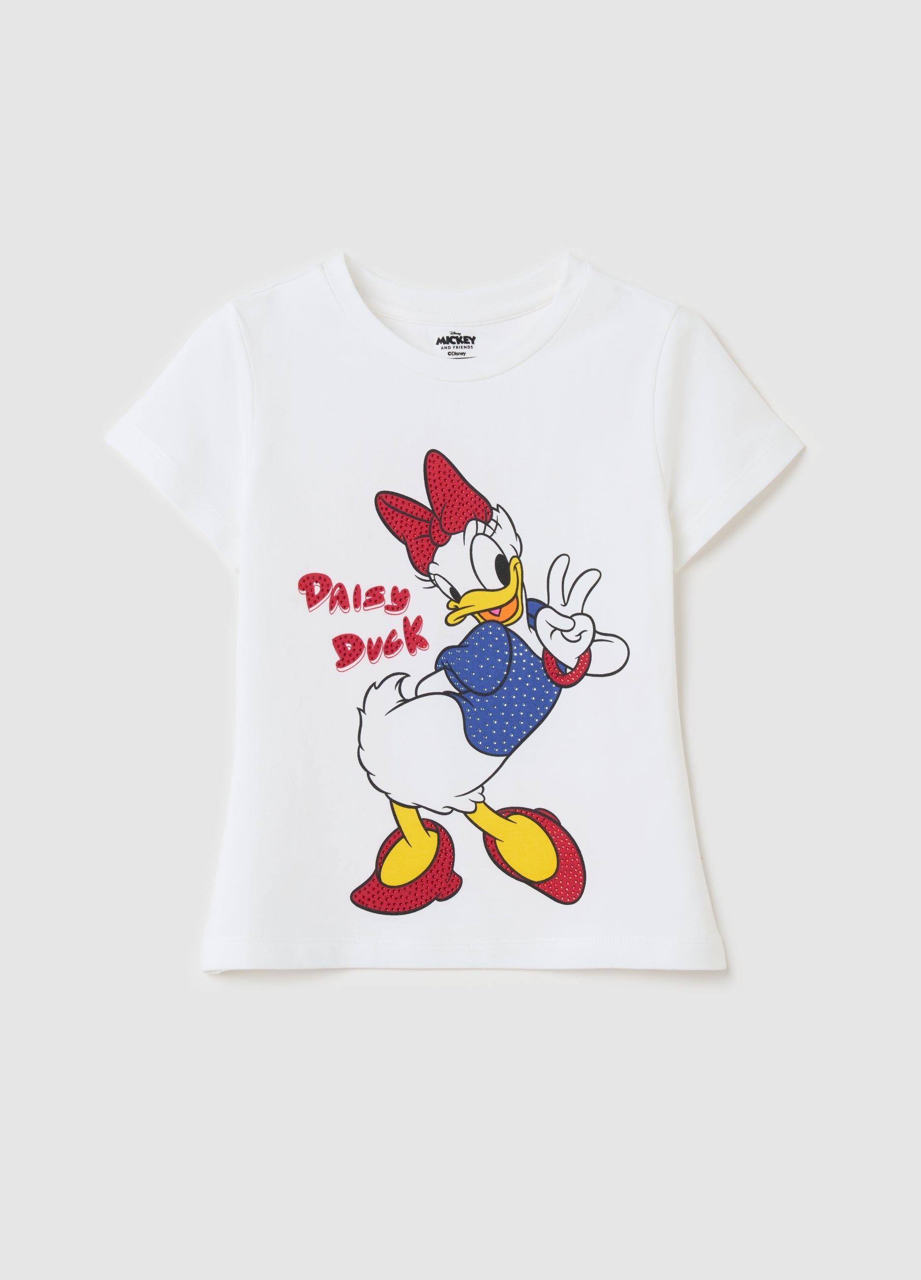 Stretch cotton t-shirt. Round neck. Disney daisy duck print with diamantã© appliquã© front.