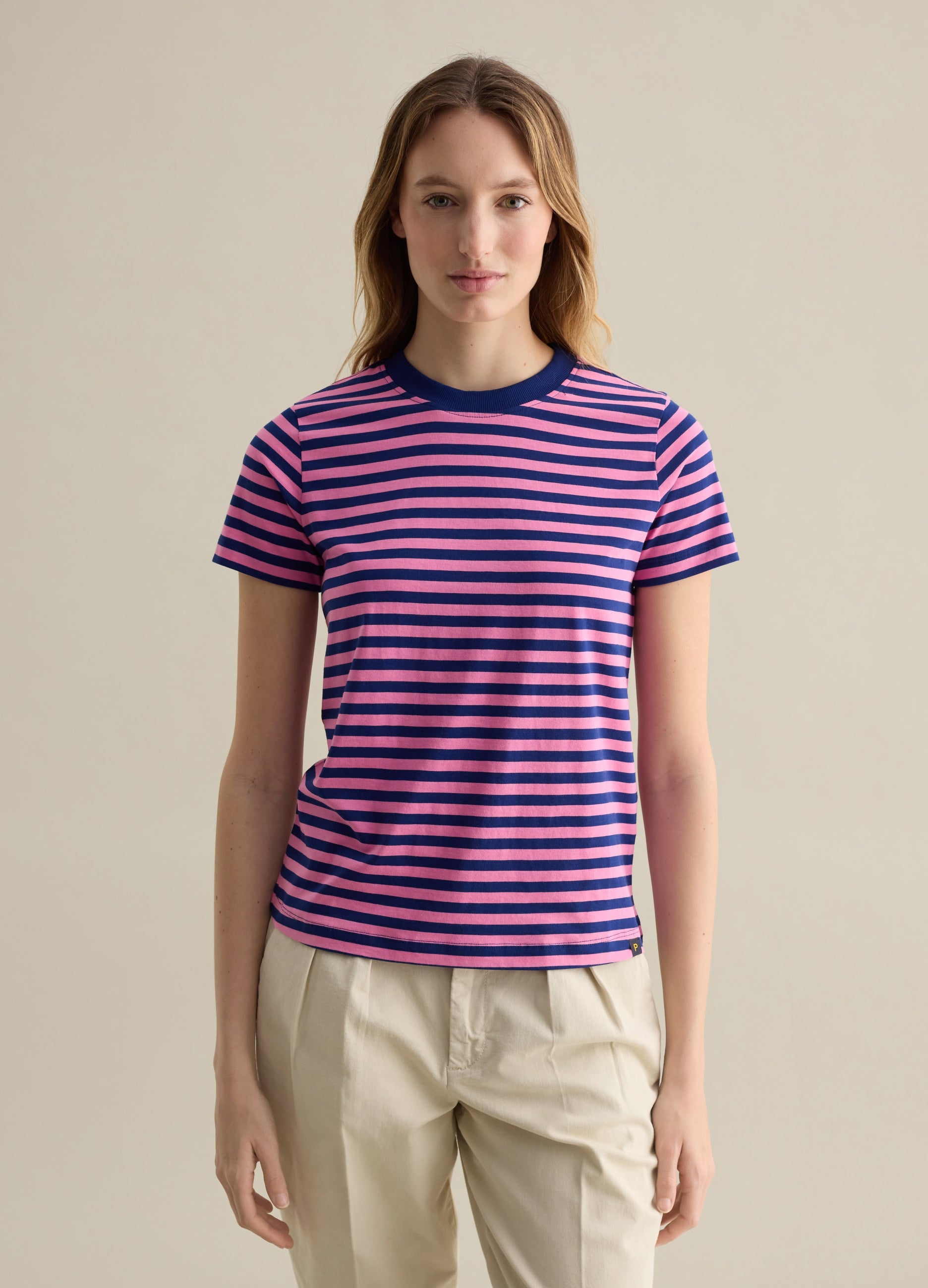 Lead pure cotton short sleeve t-shirt, perfect for spring and summer. Features a pink and blue striped design with contrasting crew neck. Regular fit for a casual and comfortable look.