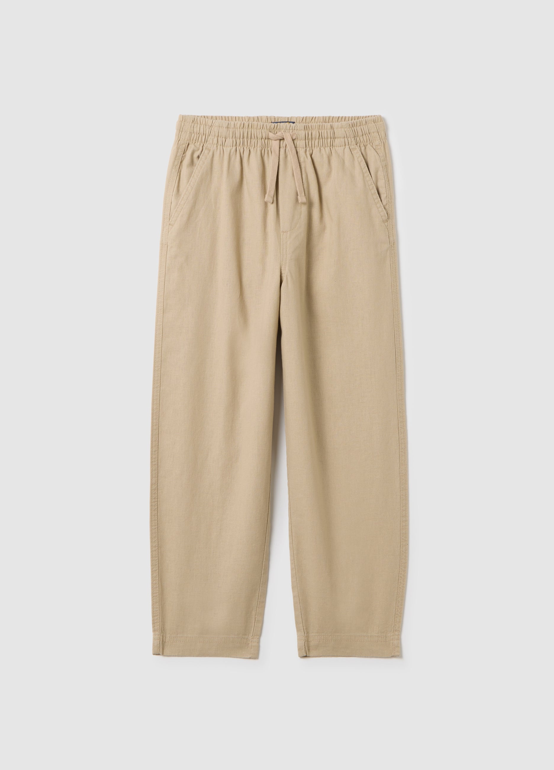 These Beige Trousers From The Ovs Kids Line Are Designed For Boys Aged 10 To 15, Perfect For Summer Days Thanks To Their Comfortable Fit. Made From A Blend Of Linen And Cotton, They Feature An Elastic Waist And Drawstring For Optimal Comfort. The Front Pockets Add Practicality, While The Rear Pocket Completes The Casual Look.