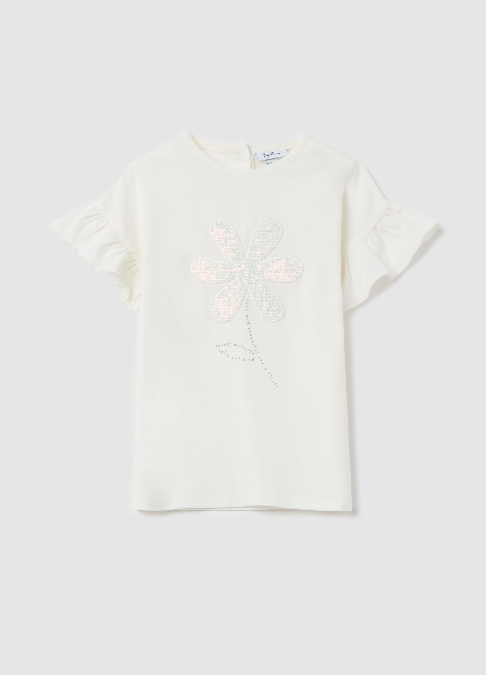 Stretch cotton t-shirt. Round neck with snap buttons on the back. Short sleeves with flounces. Flower application with shiny effect and lettering print on the front.