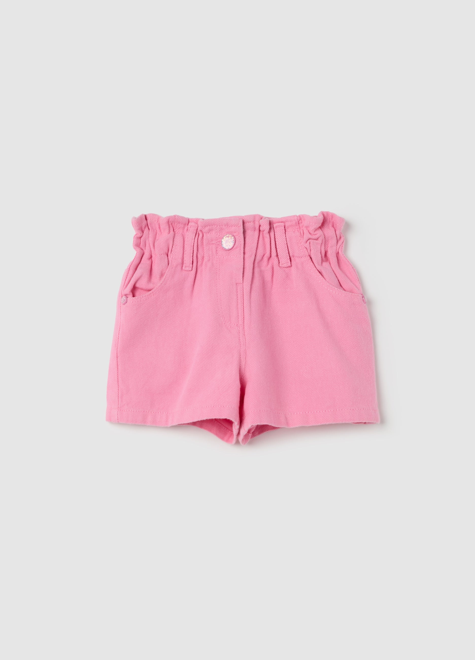 Paper bag shorts in cotton and lyocell. Elasticated waist. Two slant pockets and two patch pockets on the back. Snap button fastening.