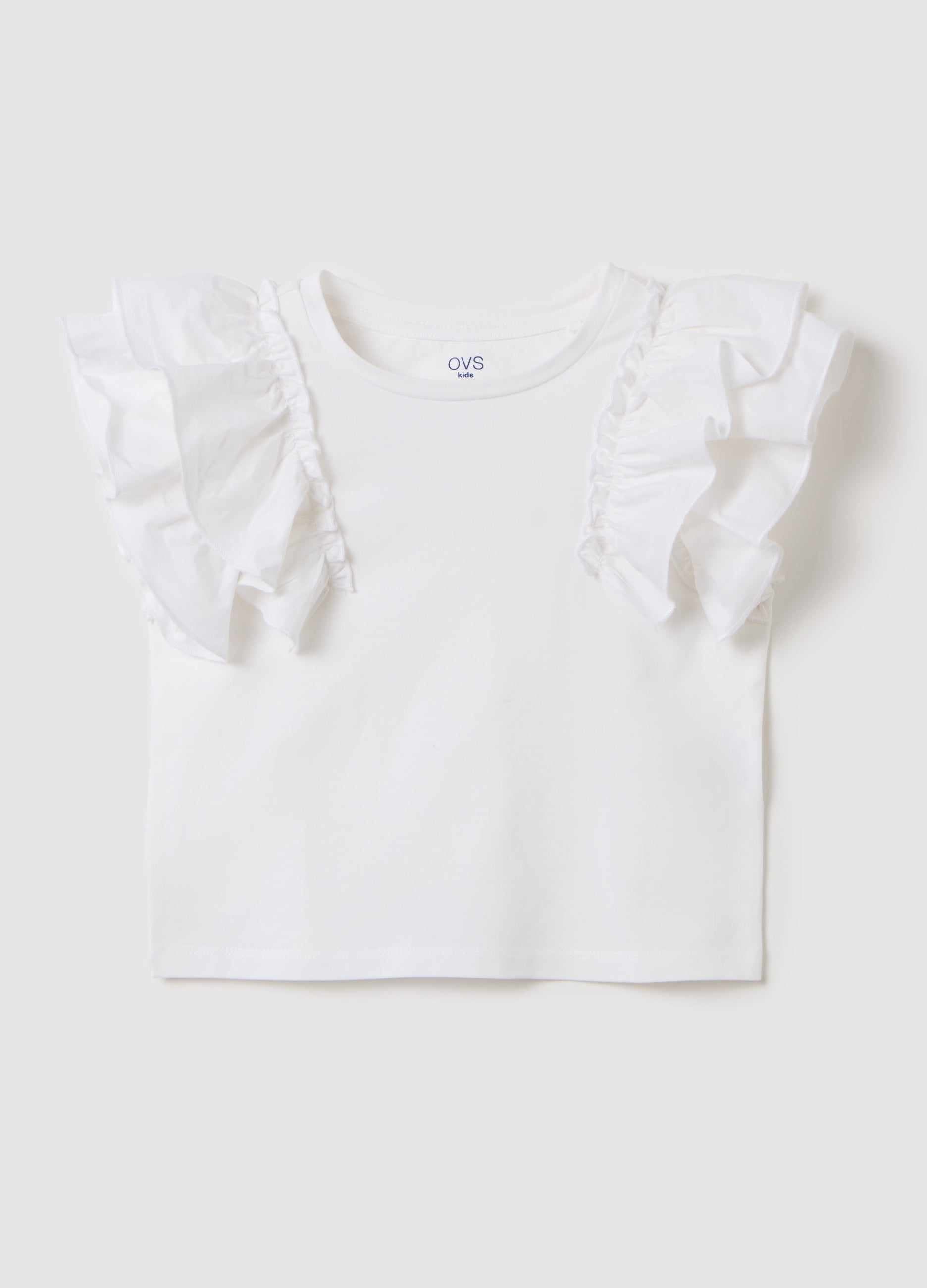 White T-Shirt In Stretch Cotton. Round Neck And Short Sleeves With Flounced Details.