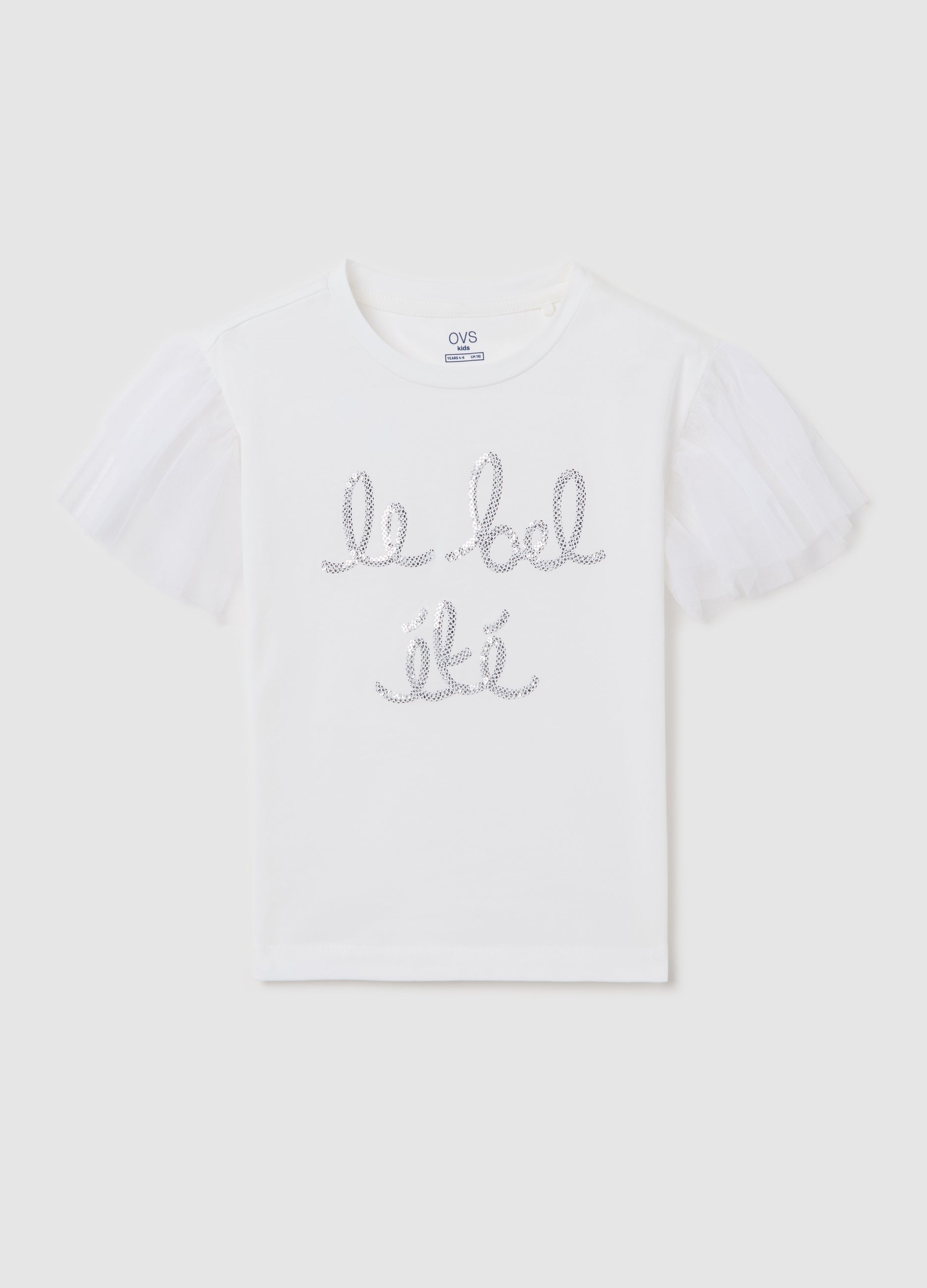 T-Shirt In 100% Cotton. Round Neck. Butterfly Sleeves With Tulle Flounce. Sequinned Lettering Application On The Chest.