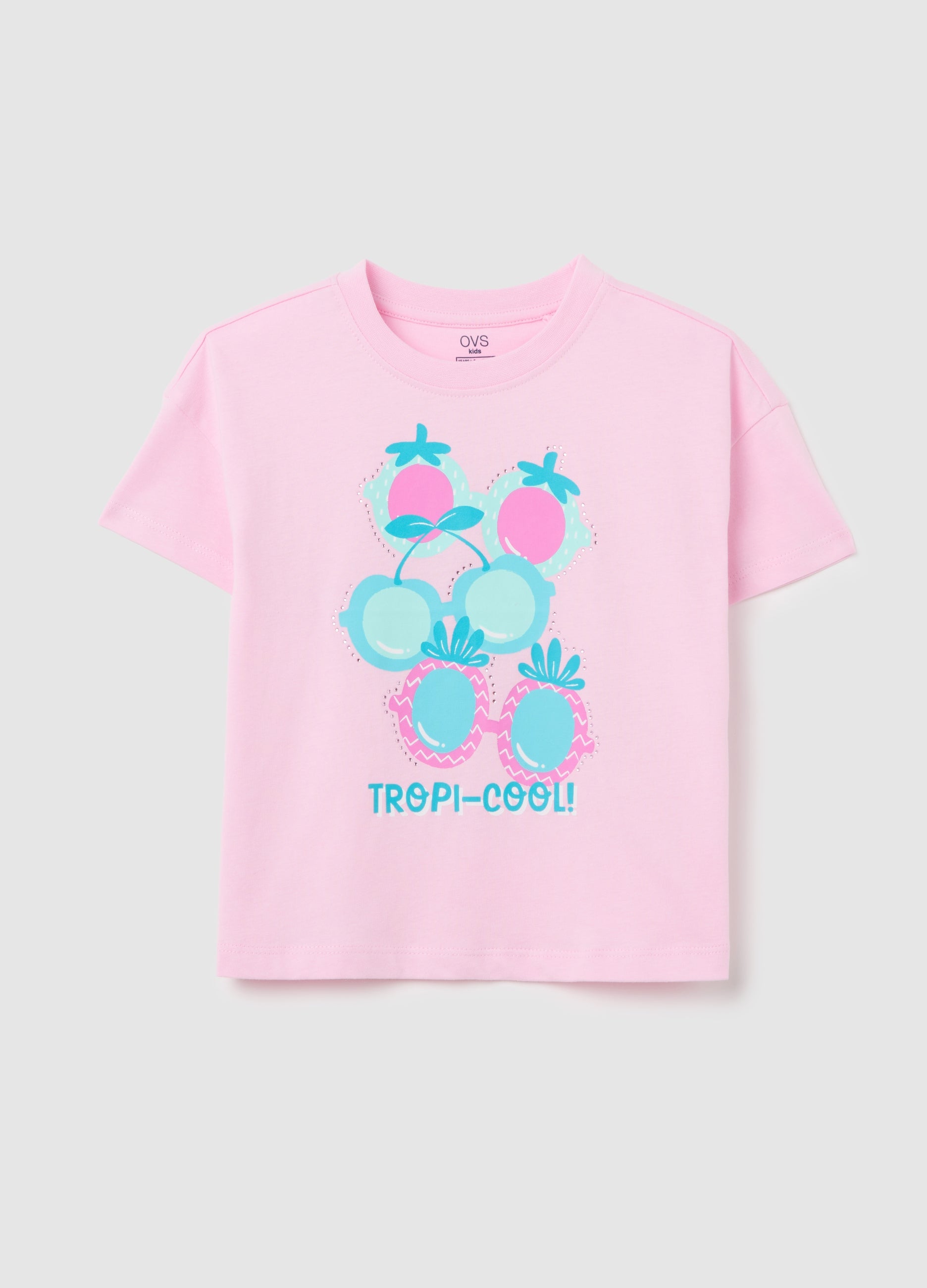 Pure Cotton T-Shirt For Girls By Ovs Kids. Round Neckline And Short Sleeves. Colourful Tropi-Cool Print On The Front.
