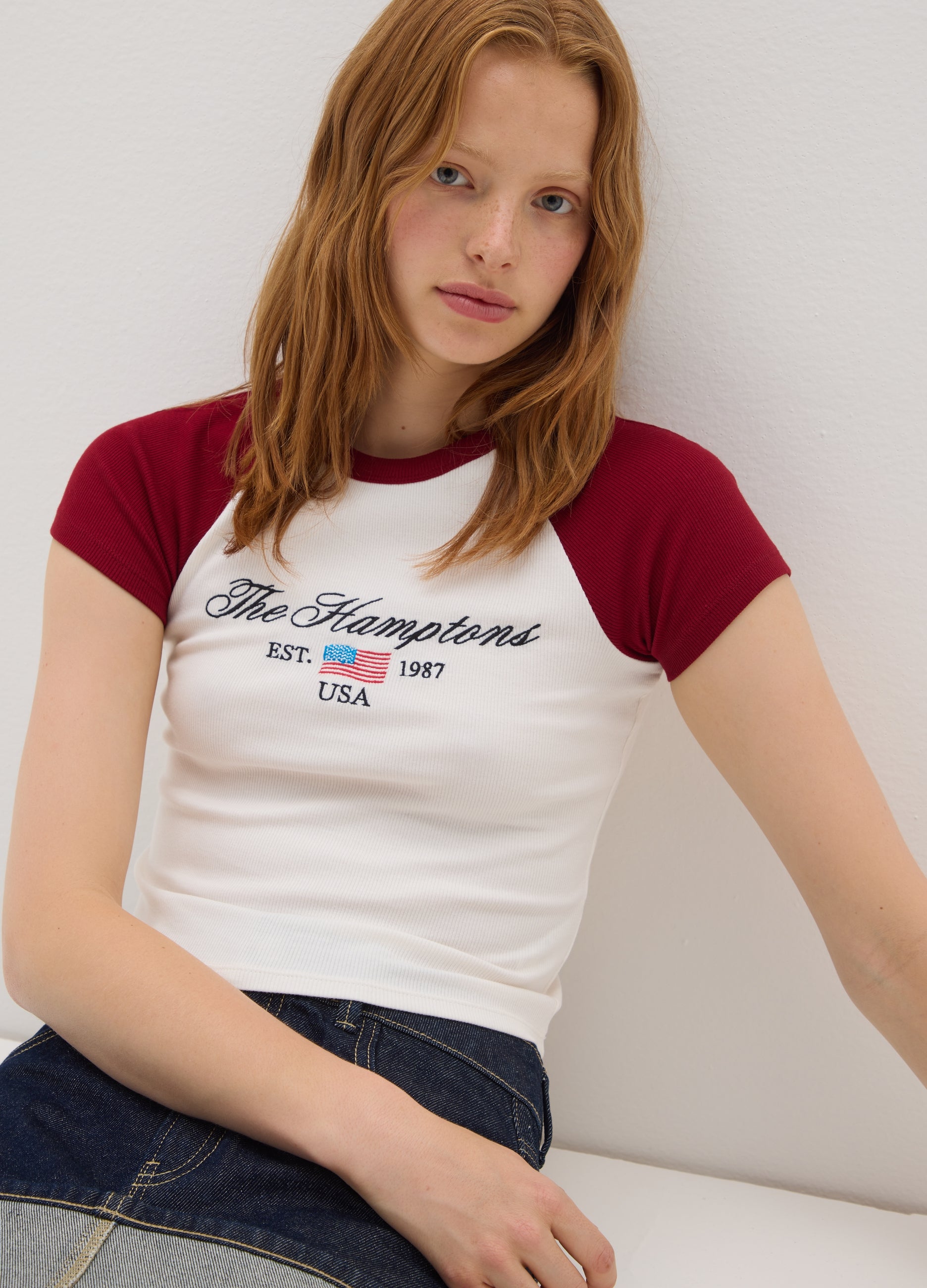 The White T-Shirt With Red Sleeves From The B.Angel Line Is A Versatile And Casual Garment, Perfect For Any Occasion. Made From Stretch Cotton, It Offers A Snug Fit That Enhances The Figure. The Crop Design With A Crew Neck And Short Sleeves Makes It Ideal For Those Who Love A Sporty Style. The Multicolor Adds A Touch Of Vibrancy To Your Wardrobe, Making It Easily Matchable With Different Outfits.
