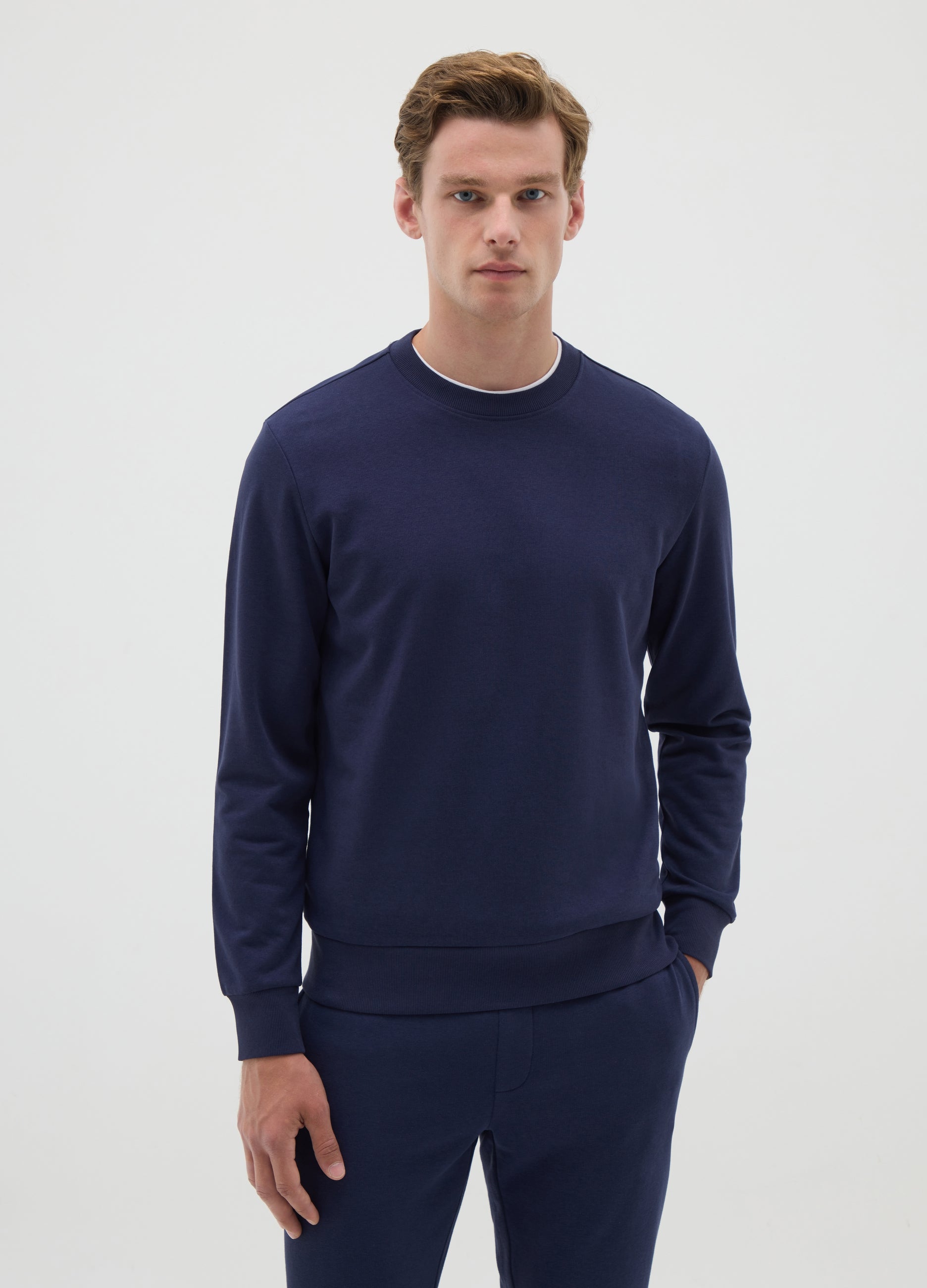 Long Sleeve Blue Crew Neck Sweatshirt. Minimalist Design With Ribbed Edges On Cuffs And Waistband. Perfect For A Casual And Comfortable Look.