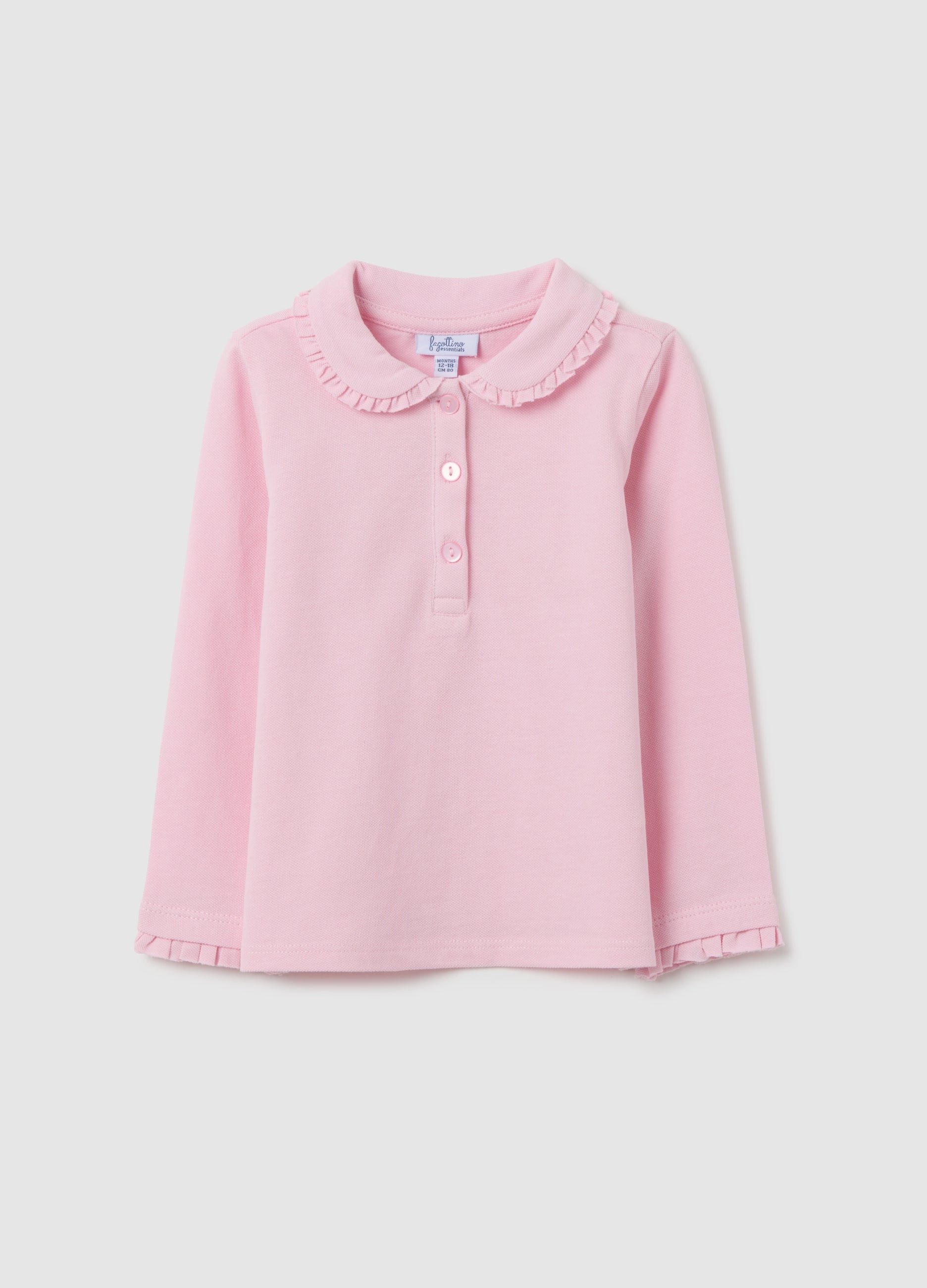 This Pink Pure Cotton Baby T-Shirt From The Fagottino Collection, For Ages 9 To 36 Months, Features A Rounded Ruffled Collar That Adds A Sweet And Sophisticated Touch To Everyday Outfits. The Front Button Closure Makes It Practical And Ideal For Cooler Days. The Ruffled Cuffs Complete The Elegant Design, Making This Garment A Versatile Choice For Various Occasions.