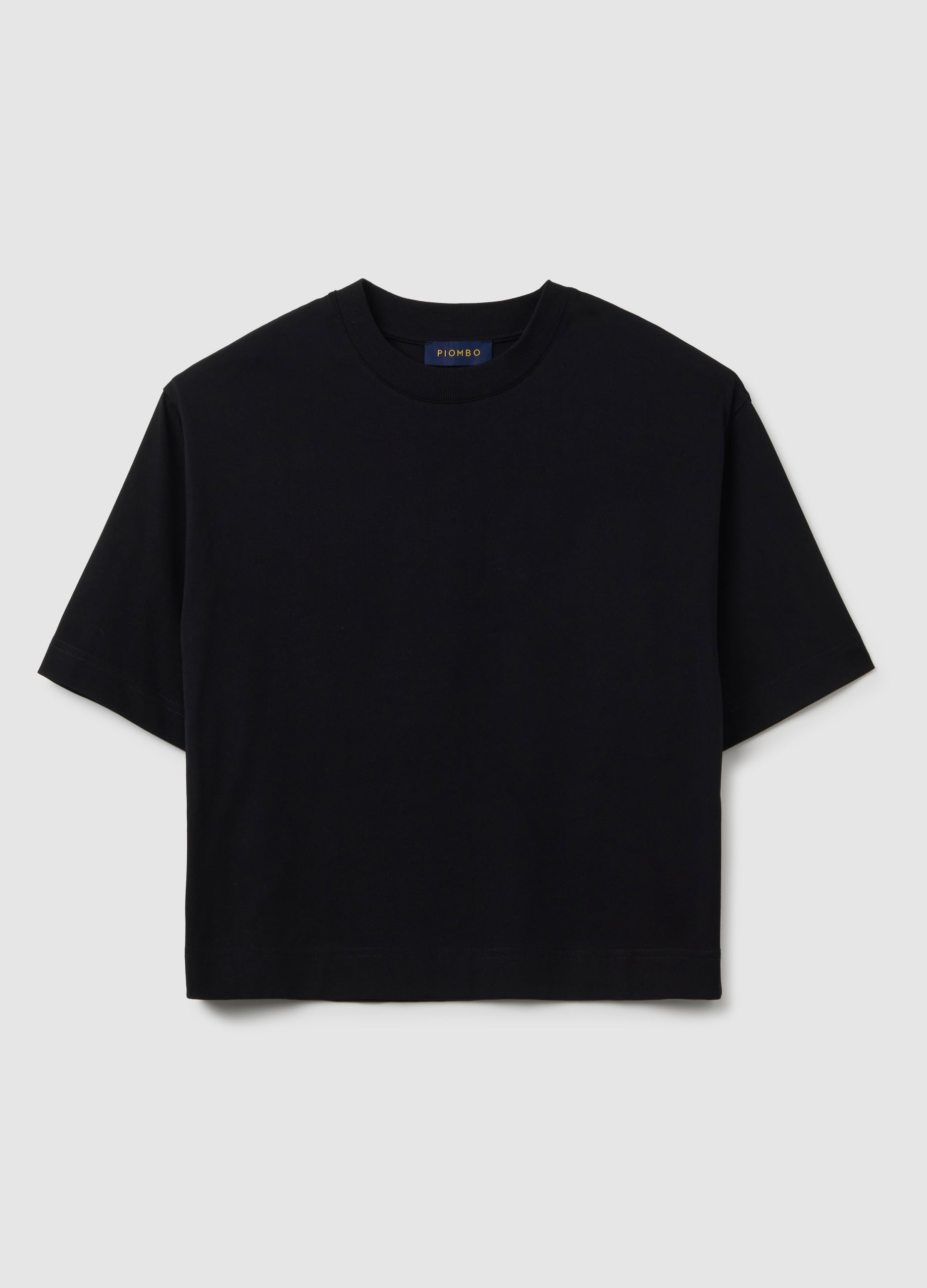 The Black T-Shirt From The Piombo Line Is Made Of Cotton Blend, A Garment That Combines Comfort And Practicality. The Short Sleeve Design And Round Neckline Offer A Boxy Fit, Perfect For Multiple Occasions. This Model Stands Out For Its Lack Of Transparency, Ideal For A Clean And Sober Look. The Black Tone Makes It Versatile And Easy To Pair With Your Favorite Outfits.